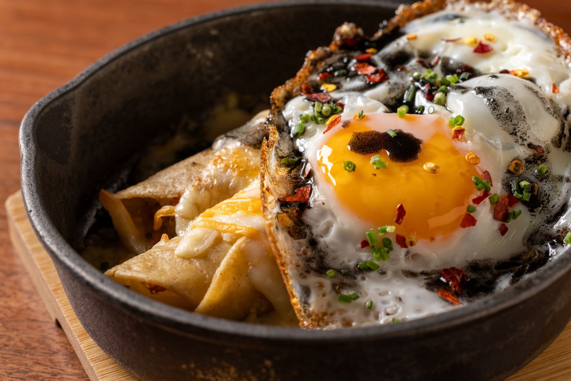 特 徴:ピリッとした刺激的な辛みをトリュフ、ポテト、たまごを絡めて調整して食べていただく一品。ウェスソイとは、野菜とチリを焦がした旨味エキスで作られてウエスオリジナルのオイル(ソース)のこと。