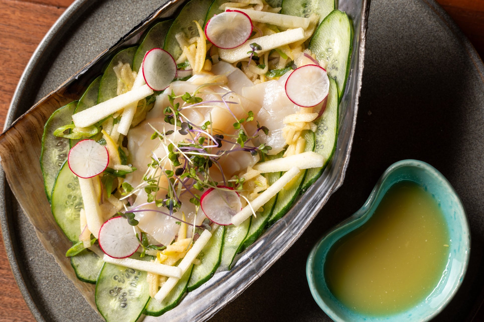 メニュー名:平貝のセビーチェ、きゅうり、赤玉ねぎ、コリアンダー、ラディッシュ、グリーンアップルと柚子のソース