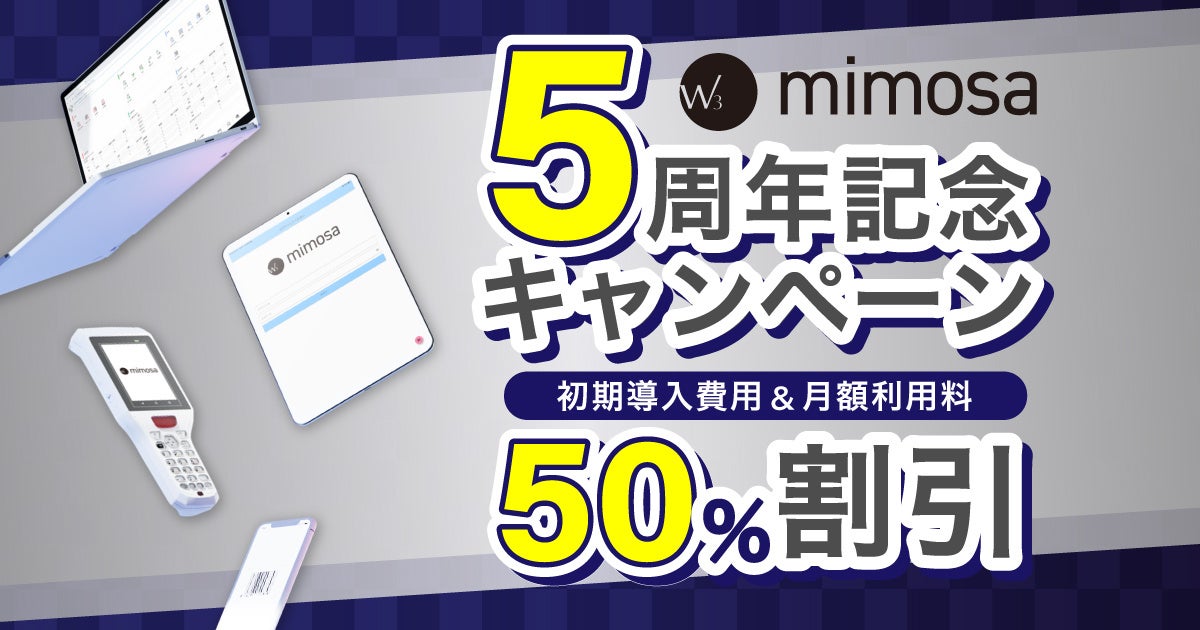 株式会社ダイアログ(本社:東京都品川区、代表取締役:方志嘉孝)は、SaaS型倉庫管理システム「W3 mimosa」がリリースから5周年を迎えたことを記念し、初期費用と月額利用料3ヶ月分が50%オフになるキャンペーンを実施いたします。