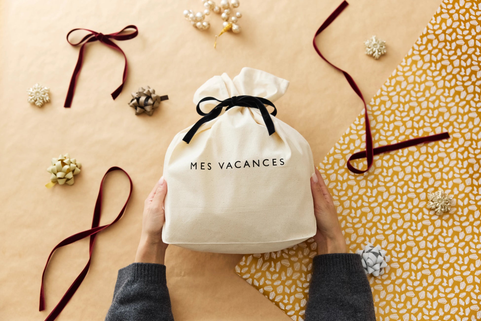 本コラボレーションのギフトはすべて、MES VACANCESで取り扱っているトートバッグをギフトBAGとして使用しています。ラッピング資材としての役割にとどまらず、日常でトートバッグとして繰り返し使える仕様としているBAG。ソフトな生地感でありながら、目の詰まった厚手のコットン素材を使用し、中に入れたものが透けにくいのも特長です。A4サイズが入るマチ付きデザインで、素材はコットン100%。使い終えたあとも、暮らしの中に自然と寄り添うやさしいギフトBAGです。
