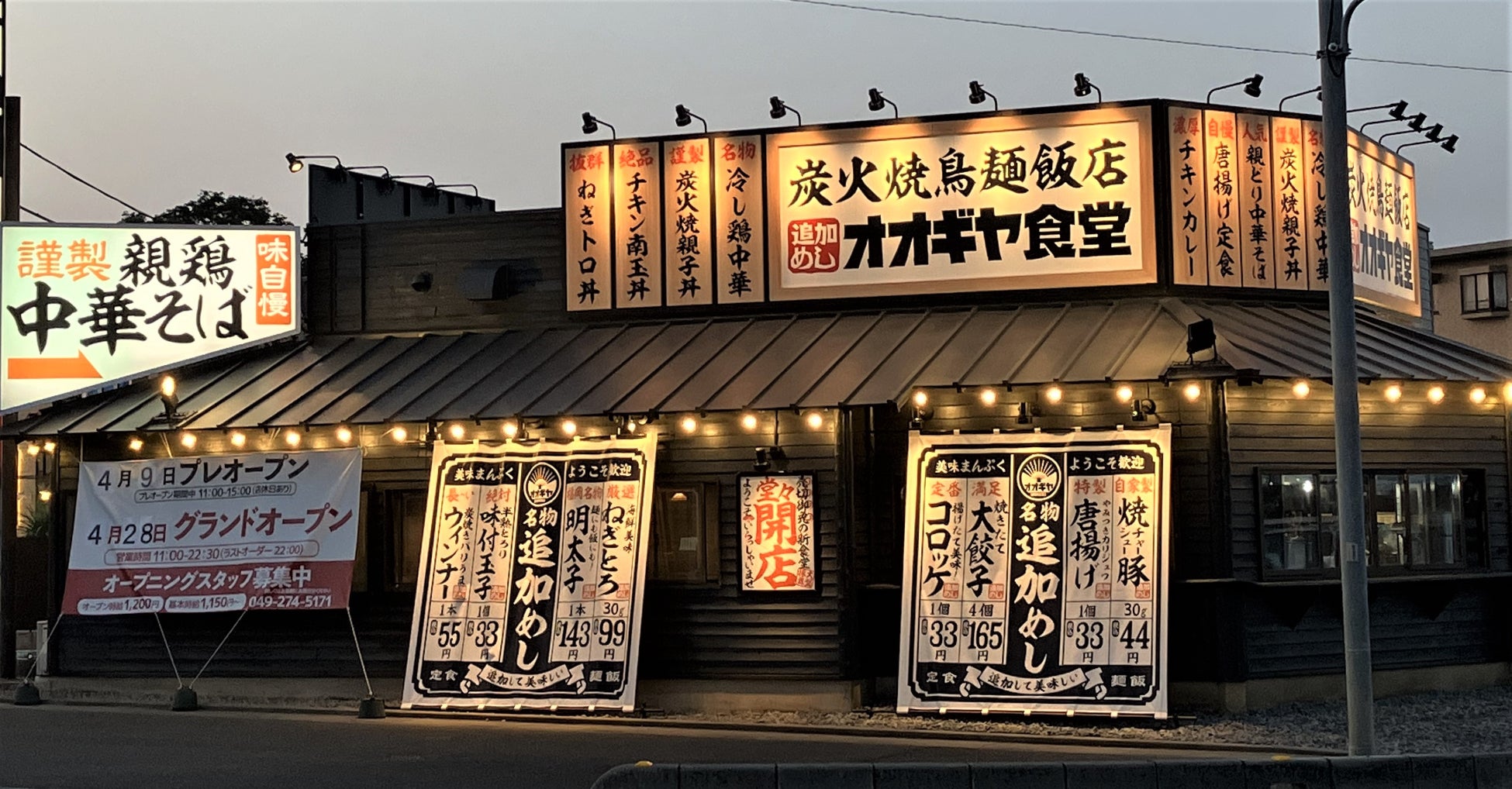 やきとりの扇屋は、「元気・笑顔・活気」をモットーに、炭火で焼きあげる焼き鳥にこだわり続け約30年、全国各地たくさんのお客様に扇屋の焼き鳥をお届けしてきました。そんな扇屋が、お客様に新たな楽しみを提供できないかと試行錯誤を重ね開発した業態が「炭火焼鶏麺飯店オオギヤ食堂」になります。これまで30年積み重ねてきた扇屋の強みである「炭火」と「鶏」を武器に、親子丼、らーめん、冷やし中華、唐揚げなど、当店でしか食べることのできない、こだわりのお料理を、お値打ち価格でご用意しました。