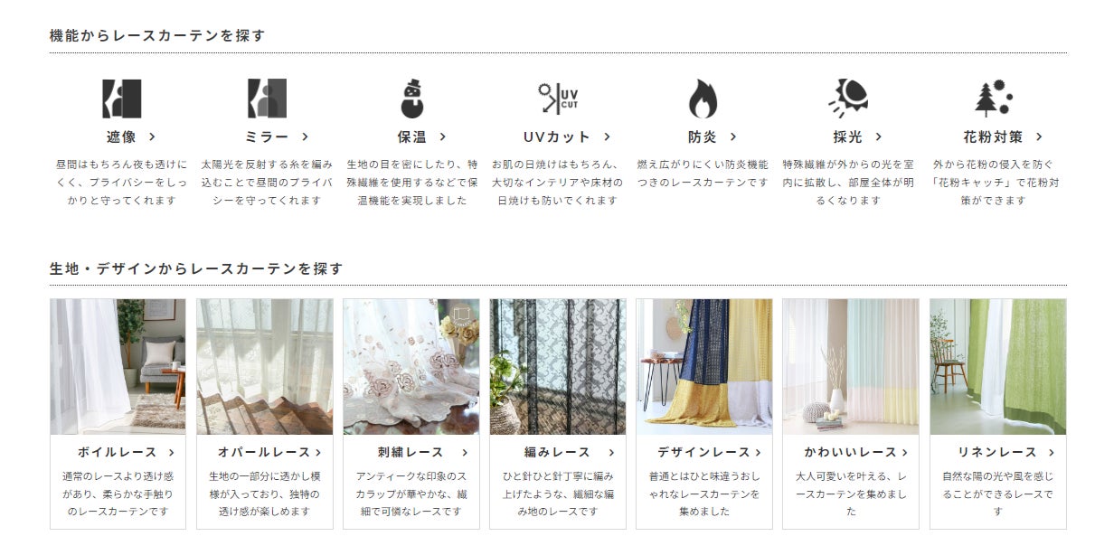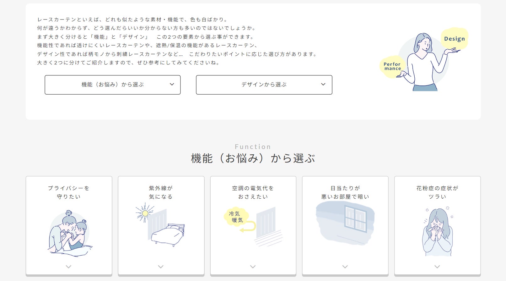 レースカーテンを選ぶ上で重要な「機能」と「デザイン」2つの観点から、お客様が理想とするレースカーテンを見つけることができる表示設計となっています。それぞれの機能の具体的な説明・実際の機能の検証内容を加えることで、お客様が抱える悩みに対して、提案可能なページ構成になっています。