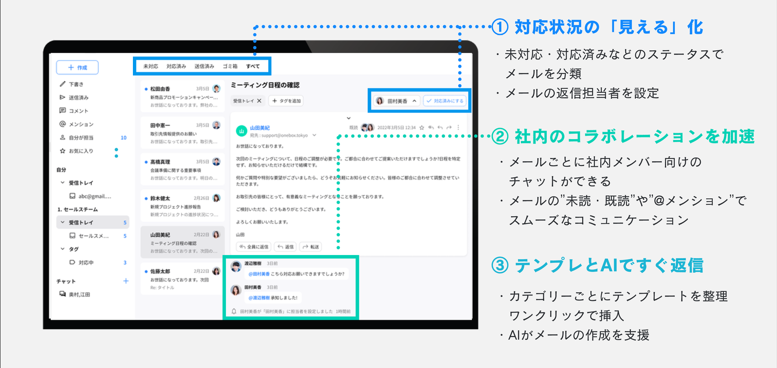 また、「yaritori AI Copilot」をはじめとしたAI機能により、メール作成や対応業務の効率化を支援し、AIと人の協働による生産性向上を実現します。