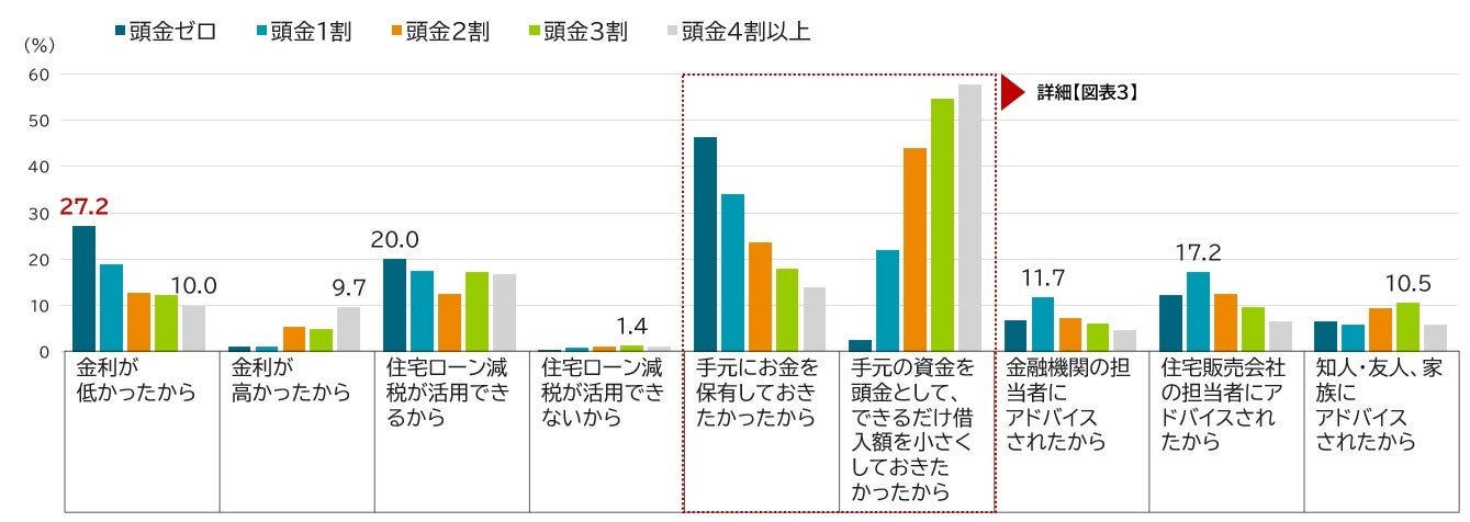 住宅ローンを申し込むうえで「頭金を何割にしなければならない」といった決まりはありません。では、住宅ローンを利用している人はどのような理由で頭金の準備割合を決めているのでしょうか。頭金の準備割合別に、その理由をお伺いしたのが【図表2】です。