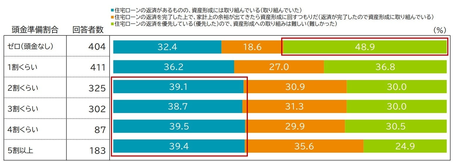 頭金の準備割合のいかんによらず30~40%の人は、住宅ローンの返済と資産形成の両立ができていることが分かりました。一方で、頭金ゼロに目を向けると「住宅ローンの返済を優先している(優先した)ので、資産形成への取り組みは難しい(難しかった)」と回答された方が約半数となり、頭金ゼロ→毎月の返済金額の増加→家計収支上、資産形成に回す資金的余裕の減少という状況が生じていると思われる結果も見られました。