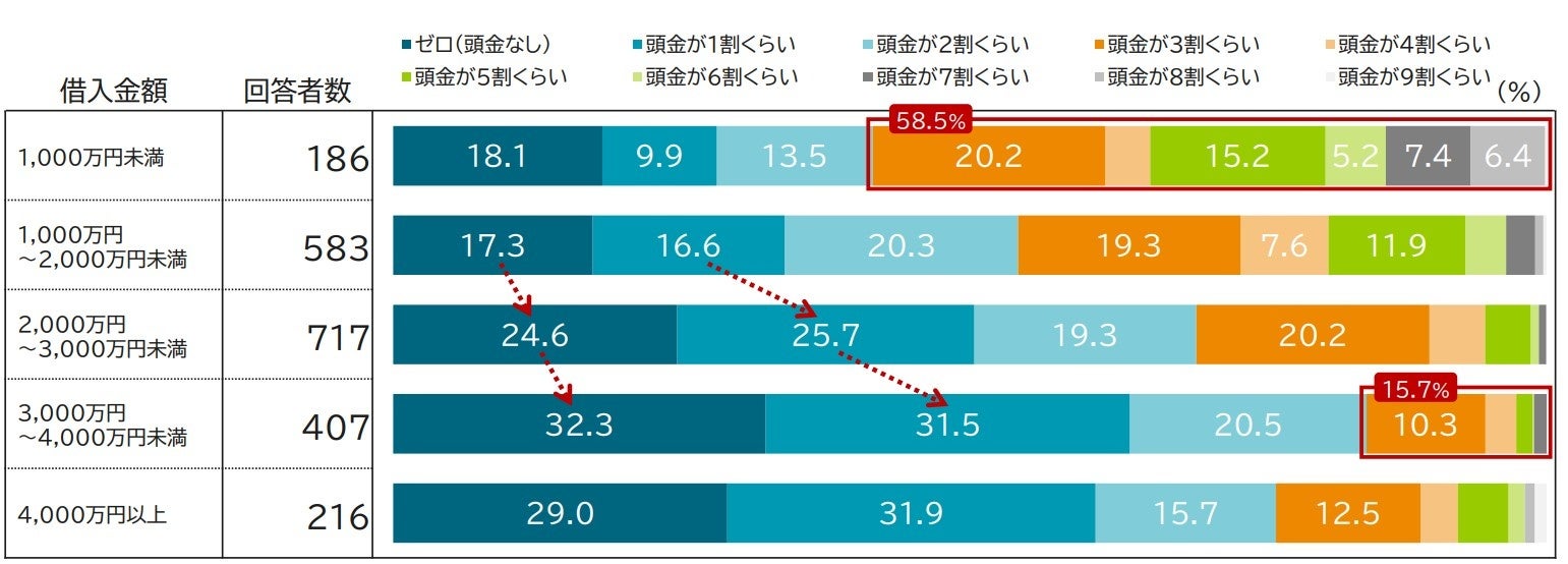また頭金「3割以上」の比率は、借入金額1,000万円未満では58.5%と半数を超える一方で、3,000万円~4,000万円未満では15.7%まで減少していることが分かりました。