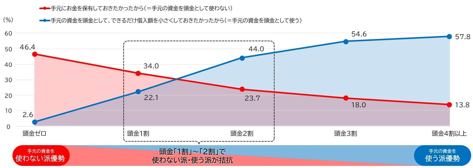また、「手元の資金を頭金として使うか・使わないか」については、頭金の準備割合によってその多寡が推移していることが分かりました【図表3】。頭金「ゼロ」では、手元の資金を頭金として「使わない派」が大きく優勢、頭金「1割」「2割」では「使わない派」「使う派」の両者が拮抗、頭金「3割以上」では「使う派」が優勢でした。