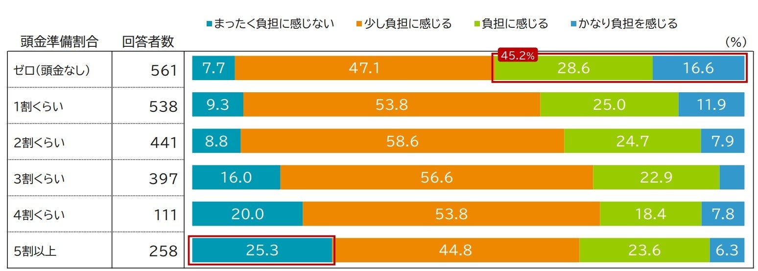 頭金「ゼロ」では、「負担に感じる」「かなり負担を感じる」の比率が45.2%と約半数となりました。反対に頭金を「5割以上」では、4人に1人が「まったく負担に感じない」と回答しました。