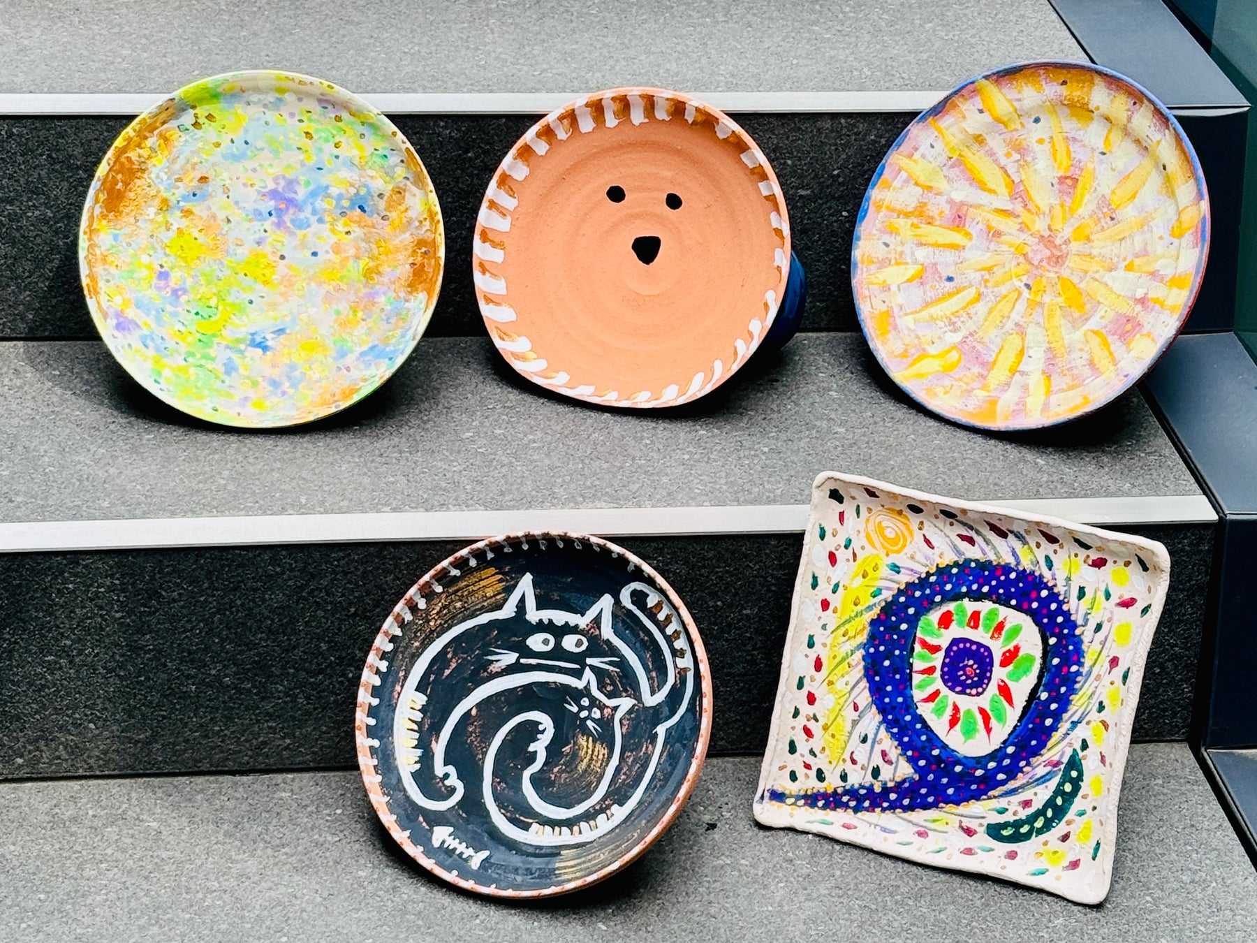 プログラムで使用する素焼きの陶器は、陶芸家・荒木漢一(あらきかんいち)氏が制作したものです。京都宇治市に工房を構える荒木氏は、当館の陶製サインを手がけています。陶芸作家の荒木氏が制作した様々な形の陶器に絵の具を使って自由に描くことが、このプログラムの魅力であり、当館ならではの贅沢な企画です。