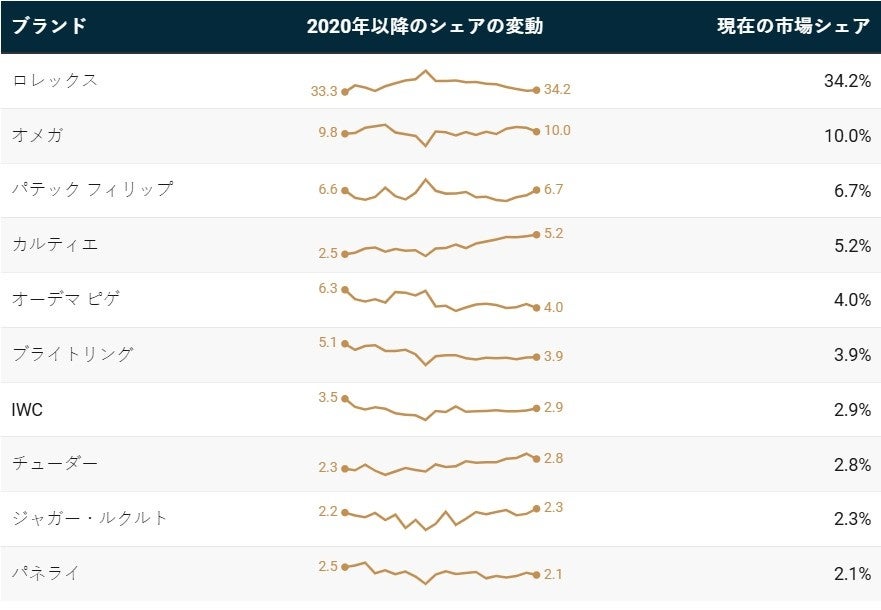 「アイコニックなデザイン、品質、高いブランド認知度を兼ね備えるロレックスは、時計ビギナーから経験豊富なコレクターまで幅広い層から支持されており、何十年もの間、一次流通市場と二次流通市場のどちらも支配してきました。これまで、ロレックスの市場シェアに対抗できるブランドは現れていません。