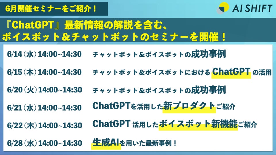 日時 | ①【オペレーター対応工数70%削減!】チャットボット / ボイスボットの最新事例紹介 6月14日(水) 14:00~14:30 ②【ChatGPTと従来のAIチャットボットの違いを徹底解説!】チャットボット・ボイスボットにおけるChatGPTの活用について 6月15日(木) 14:00~14:30 ③【パートナー企業向け】チャットボット/ボイスボットを用いたカスタマーサポートDXの成功例 6月20日(火) 14:00~14:30 ④ ChatGPTを活用した、業務効率化を加速する新プロダクトのご紹介 6月21日(水) 14:00~14:30 ⑤ 【ChatGPTを活用したボイスボット新機能!】電話終了後の業務効率化を実現! 6月22日(木) 14:00~14:30 ⑥話題の生成AIを用いた最新事例をご紹介! 6月28日(水) 14:00~14:30 |