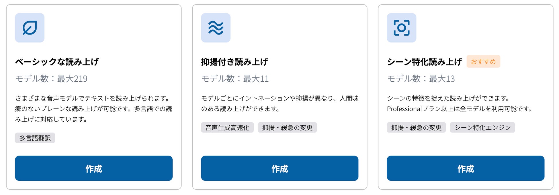 モデルごとに喋り方やイントネーションが異なり、より人間味があるAI音声の生成が可能な「シーン特化エンジン」では、eラーニング・館内放送・関西弁・アニメキャラなど、利用シーンに応じて最適な読み上げ方を指定し、AI音声を生成することができます。