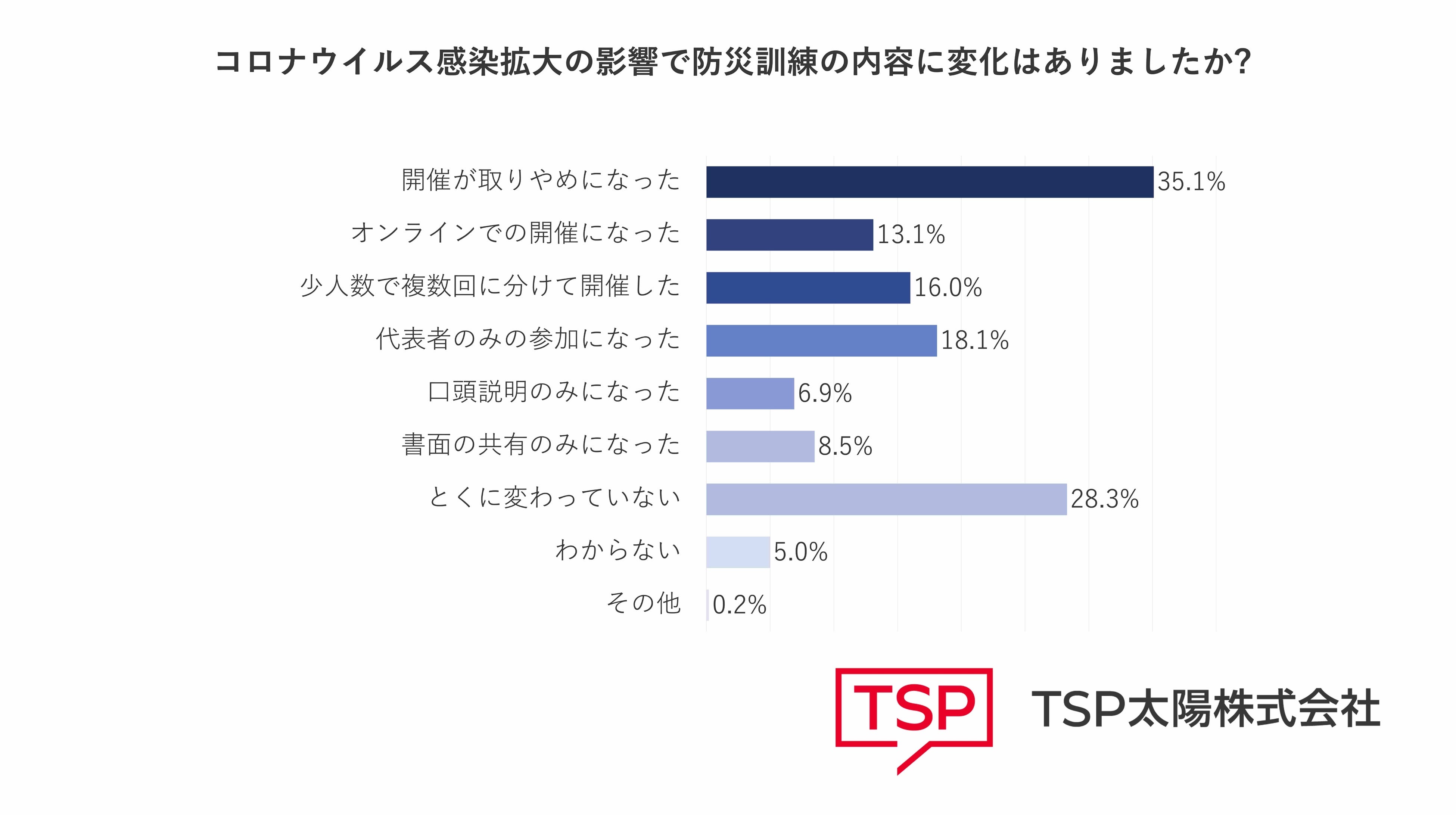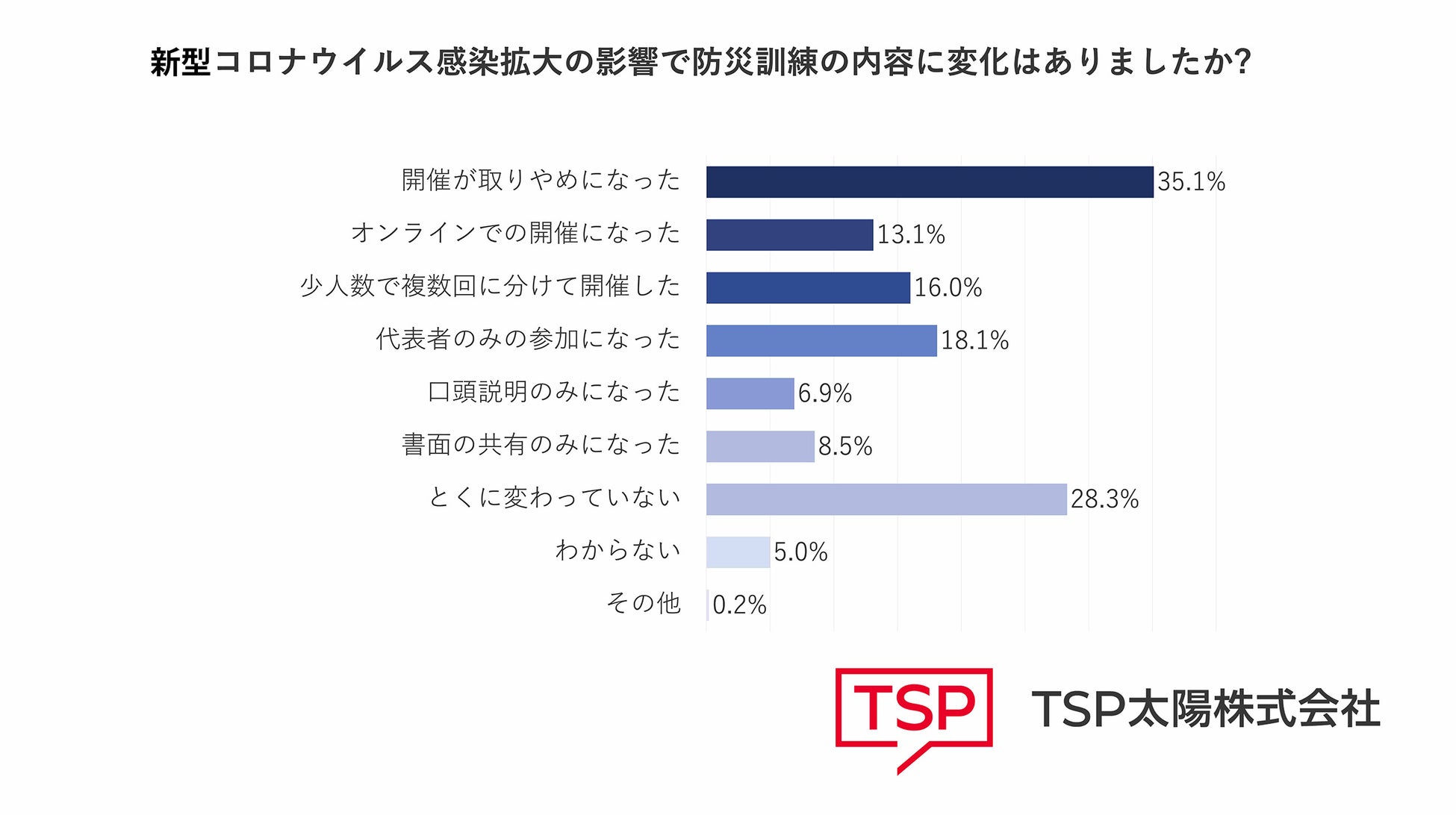 新型コロナウイルス感染拡大の影響で防災訓練の内容に変化があったかと聞いたところ、もっとも多い回答は「開催が取りやめになった」(35.1%)、次いで「特に変わっていない」(28.3%)となっています。一方で代表者のみの参加、少人数での開催、オンラインでの開催が増えたなど、約7割の企業で防災訓練の内容に変化があったと分かります。