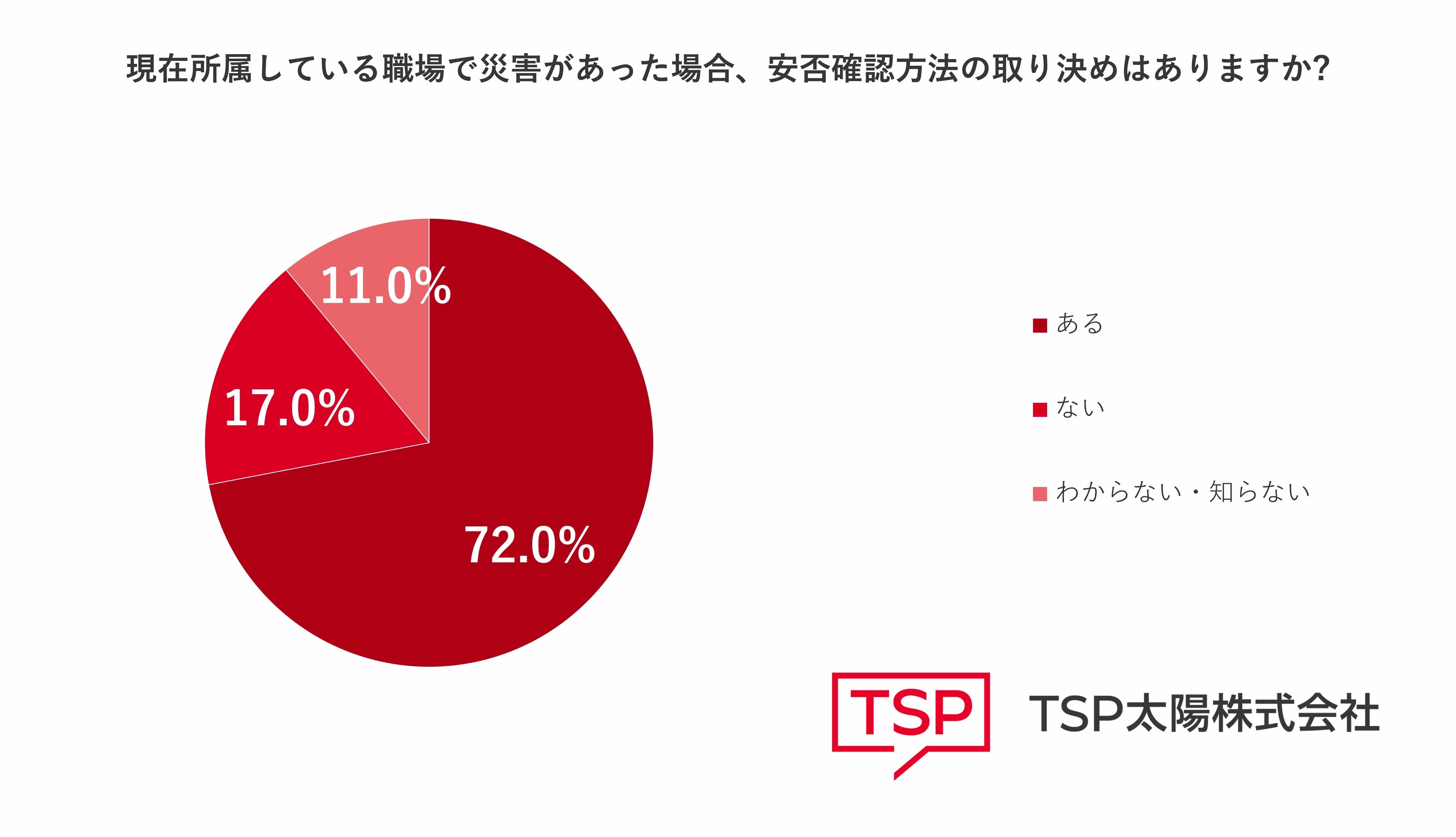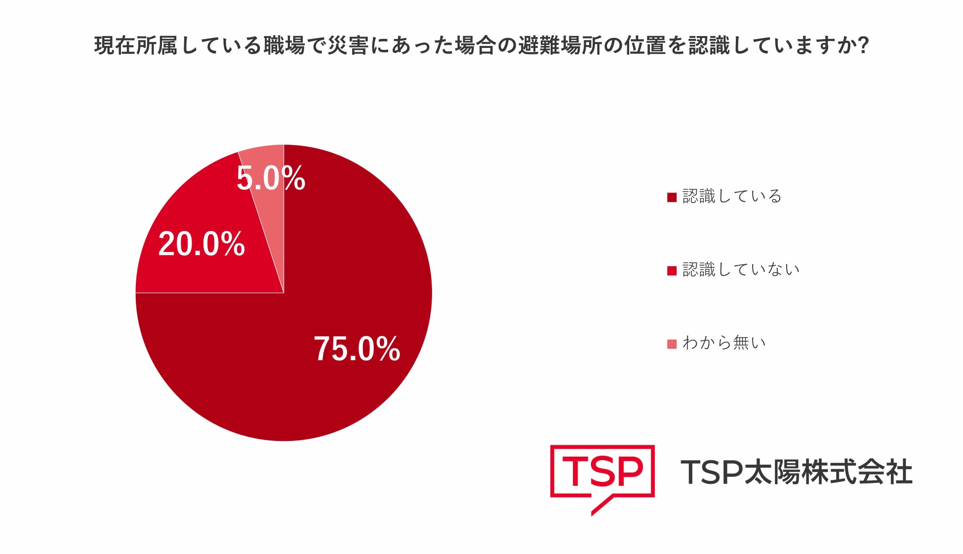 職場で災害があった場合の安否確認方法の取り決めと避難場所の認識についての質問に対して、いずれも7割を超える方が認識していると答えており、安全確保の意識が高いことがわかります。一方で安否確認方法の取り決めと避難場所を認識していないという回答も3割近いため、安全意識の低い社員が一定数いるのも事実です。災害時の混乱を避け、より素早く安全を確保するために、意識の低い社員に対してもいかに啓蒙していくかが大切だと考えます。