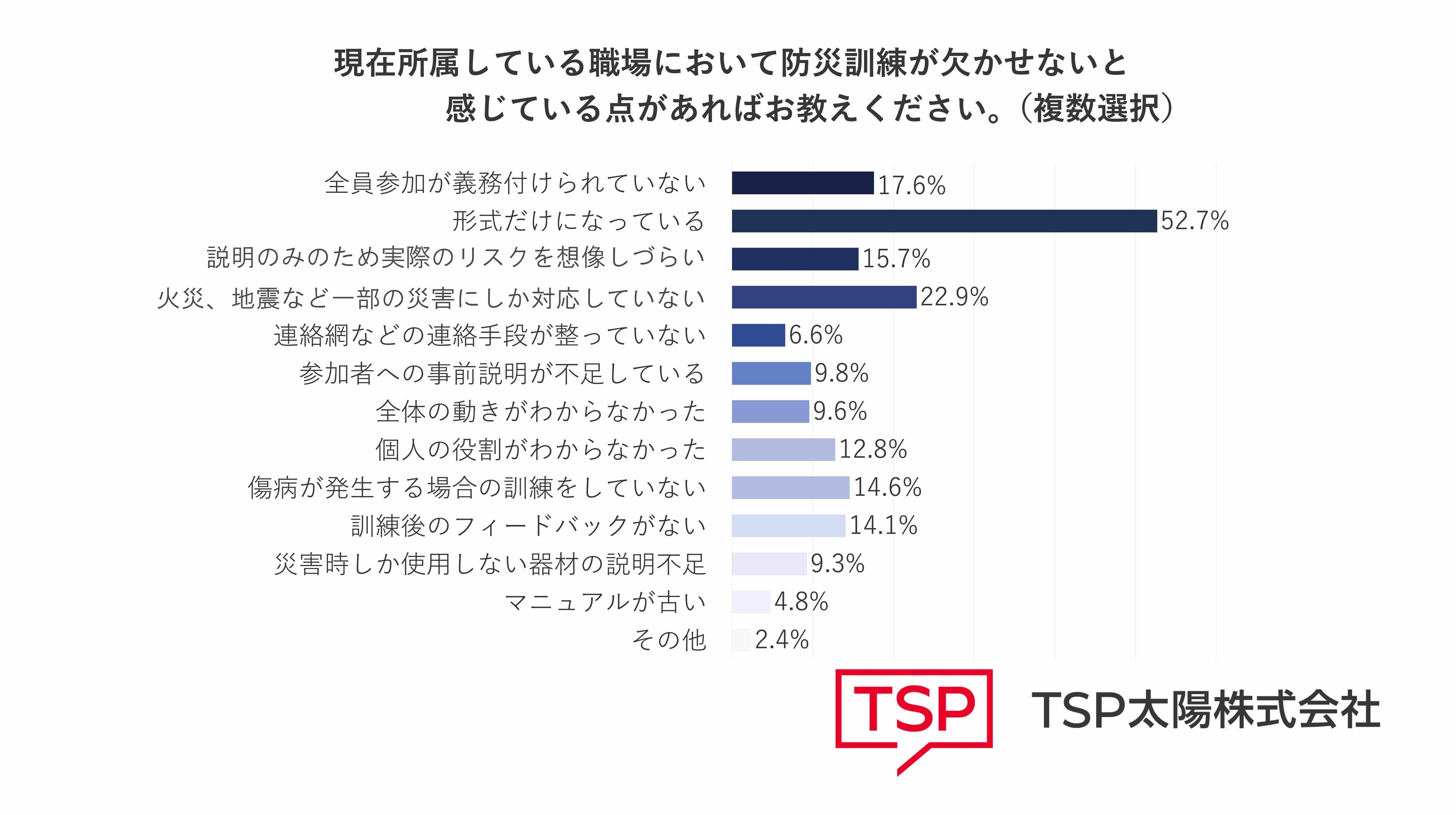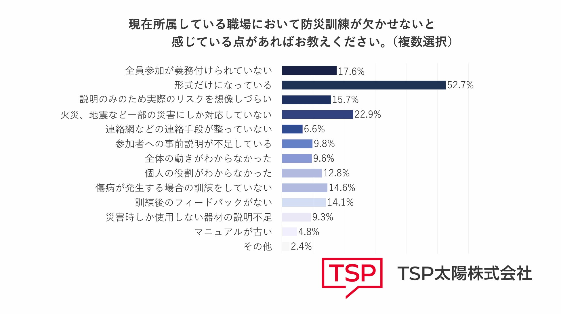 現在所属している職場において防災訓練を活かせていないと感じている点を聞いたところ、最多の回答が「(防災訓練が)形式だけになっている」で52.7%でした。「全員参加が義務付けられていない」(17.6%)、「説明のみのため実際のリスクを想像しづらい」(15.7%)、「訓練後のフィードバックがない」(14.1%)、「個人の役割がわからなかった」(12.8%)、「全体の動きがわからなかった」(9.6%)など、防災訓練が形式化してしまっているため、説明不足になっていたり、予期せぬリスクの想定ができなくなっていたり、災害を自分ゴト化できていないと考えられます。