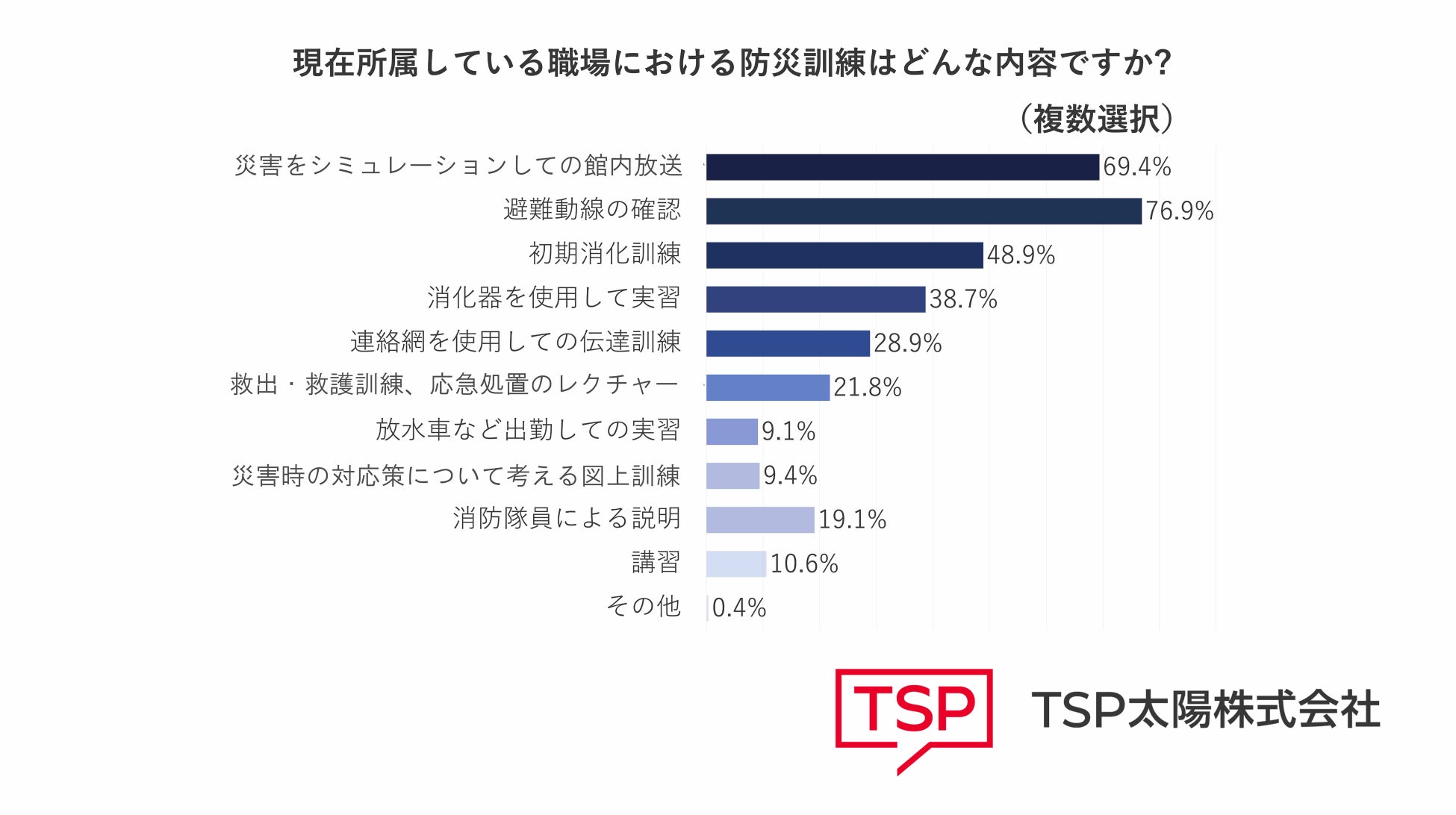 続いて、現在所属している職場における防災訓練の内容を問いかけたところ、もっとも多い回答は「避難動線の確認」で76.9%、次に「災害をシミュレーションしての館内放送」69.4%、「初期消火訓練」48.9%、「消火器を使用しての実習」で38.7%となっています。このように「消防法第36条(防災管理定期点検報告)」で消火、通報及び避難訓練の実施を義務付けられているため、消火訓練・避難訓練を想定した訓練が多く行われていることがわかります。