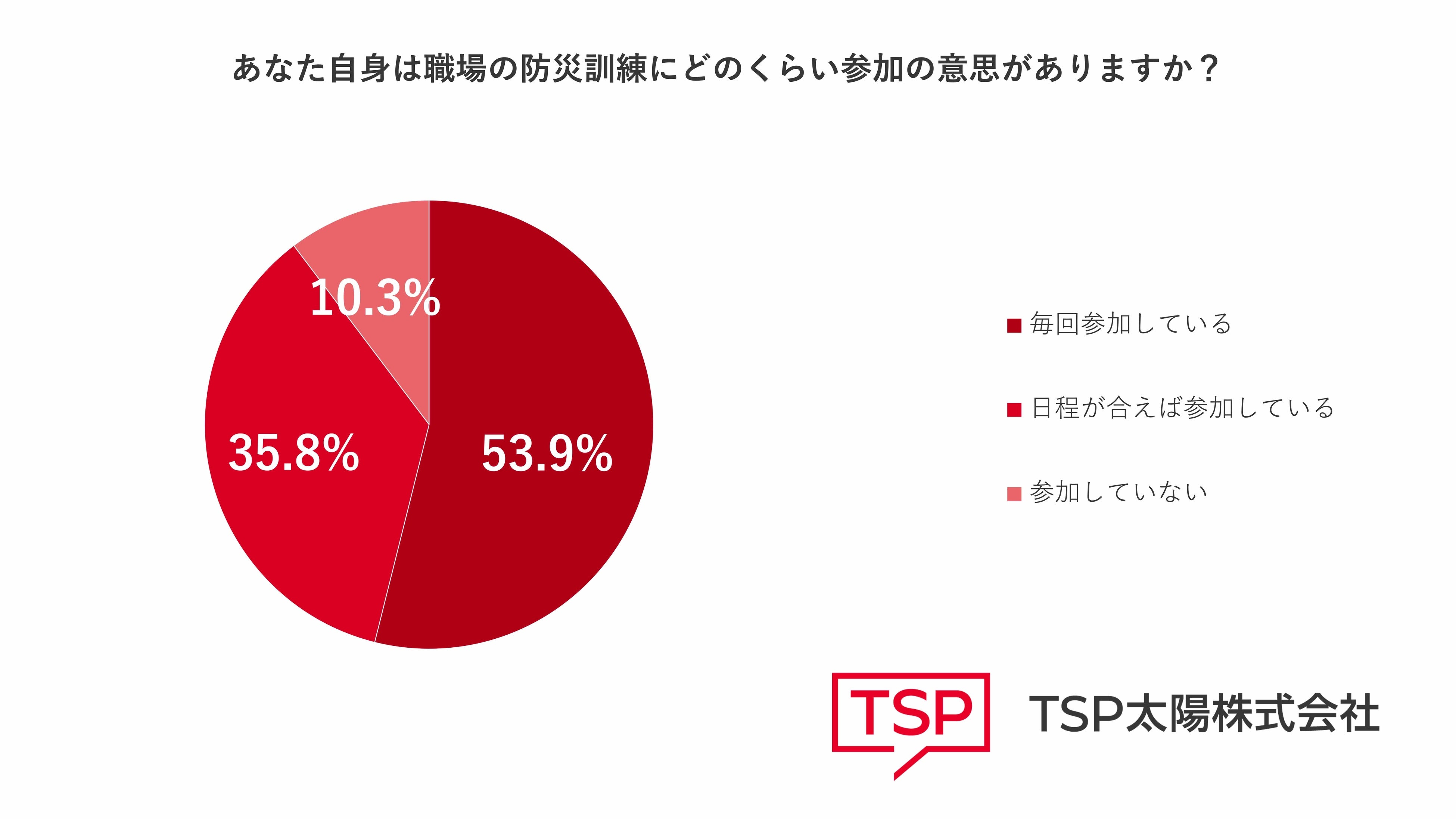 職場で開催される防災訓練への参加意思を聞いたところ、「毎回参加している」「日程が合えば参加している」という回答を足すと約9割を占めており、大多数の方に参加の意思があることがわかりました。初期消火や救出救助活動を行うには日頃からの訓練が欠かせないため、「参加していない」(10.3%)と回答した方も含めた全従業員が防災訓練に参加できる環境を整える必要があります。