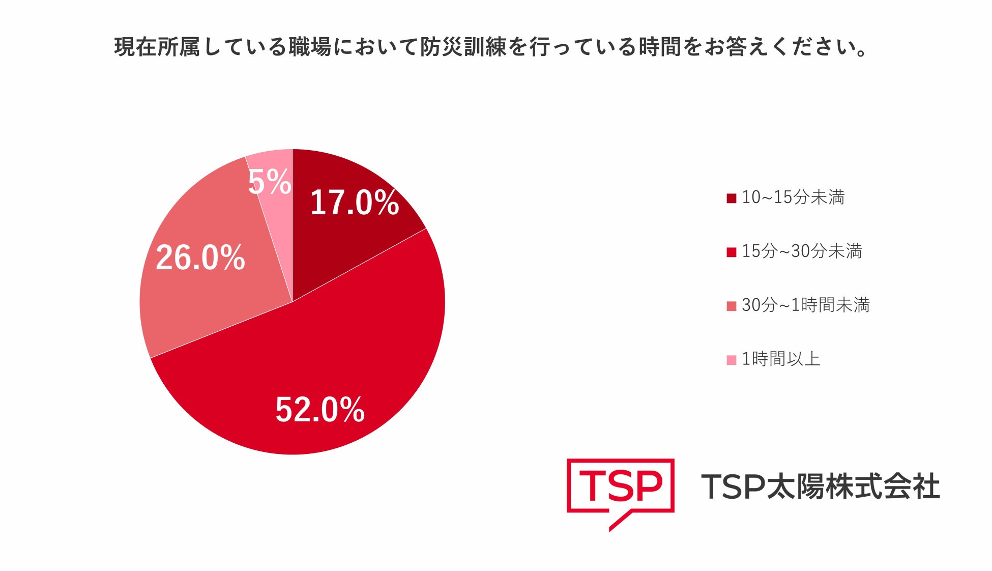 防災訓練を行う時間については、15~30分未満が52%、30分~1時間未満が26%、10~15分未満が17%となっており、1時間以上訓練を行っているという回答は5%でした。訓練時間30分未満の職場が約7割を占めています。防災訓練は様々なパターンを想定、繰り返し行うことで安全を確保するまでの時間を短縮、素早く安否確認できるようになります。