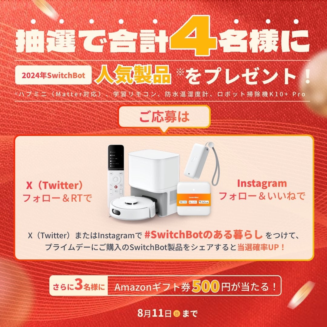 ※XまたはInstagramで「#SwitchBotのある暮らし」をつけて、プライムデーで購入したSwitchBot製品をシェアすると、当選確率UP!