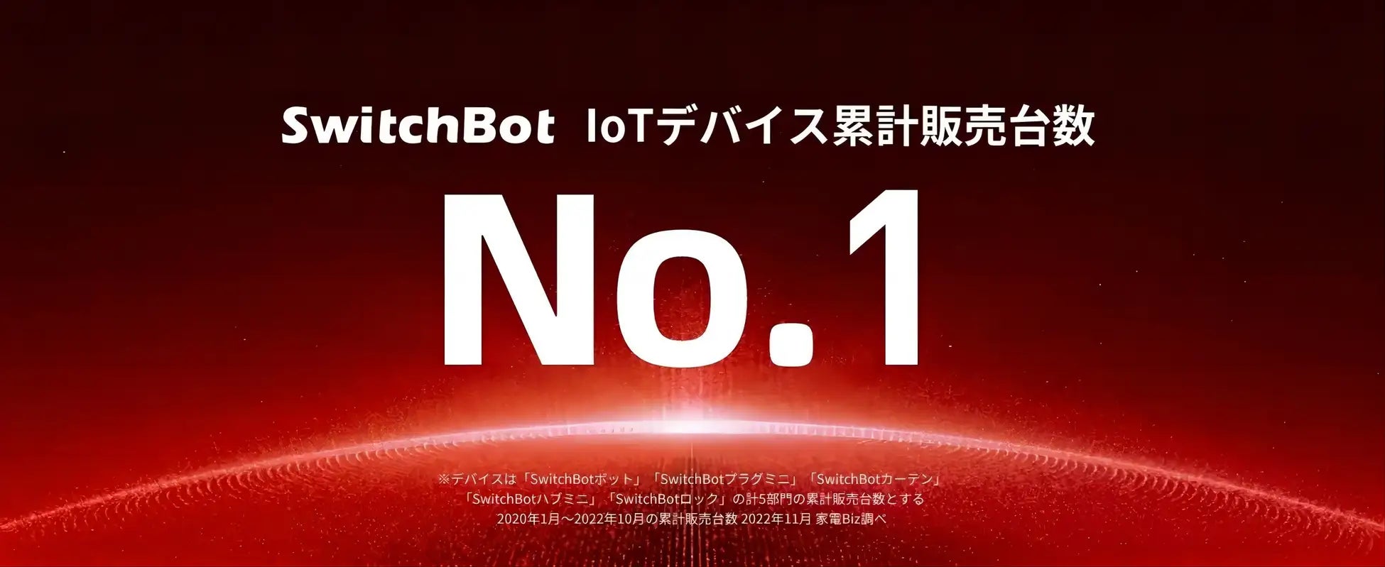 SwitchBotは、世界100以上の国や地域に向けIoTスマートホームデバイスの企画、製造、販売を行うスマートホームブランドです。従来の家具や家電を後付けでスマート化できる便利性や自由に組み合わせられる拡張性の高さが評価され、日本国内のユーザーは200万世帯超え、販売累計台数は500万台を突破しました。 また、おかげさまで弊社の「SwitchBotボット」「SwitchBotプラグミニ」「SwitchBotカーテン」「SwitchBotハブミニ」「SwitchBotロック」の計5製品が「IoTデバイスNo.1」を獲得。さらに、SwitchBotプラグミニ、SwitchBotカーテン、SwitchBotハブミニ、SwitchBotロックがそれぞれ「IoTデバイス スマートプラグ 売上No.1」「IoTデバイス カーテン 売上No.1」「IoTデバイス スマートリモコン 売上No.1」「IoTデバイス スマートロック 売上No.1」を獲得いたしました。今後も手軽にスマートホームが実現できるクリエイティブな製品を提供できるよう、先端技術の開発・改善に努めてまいります。
