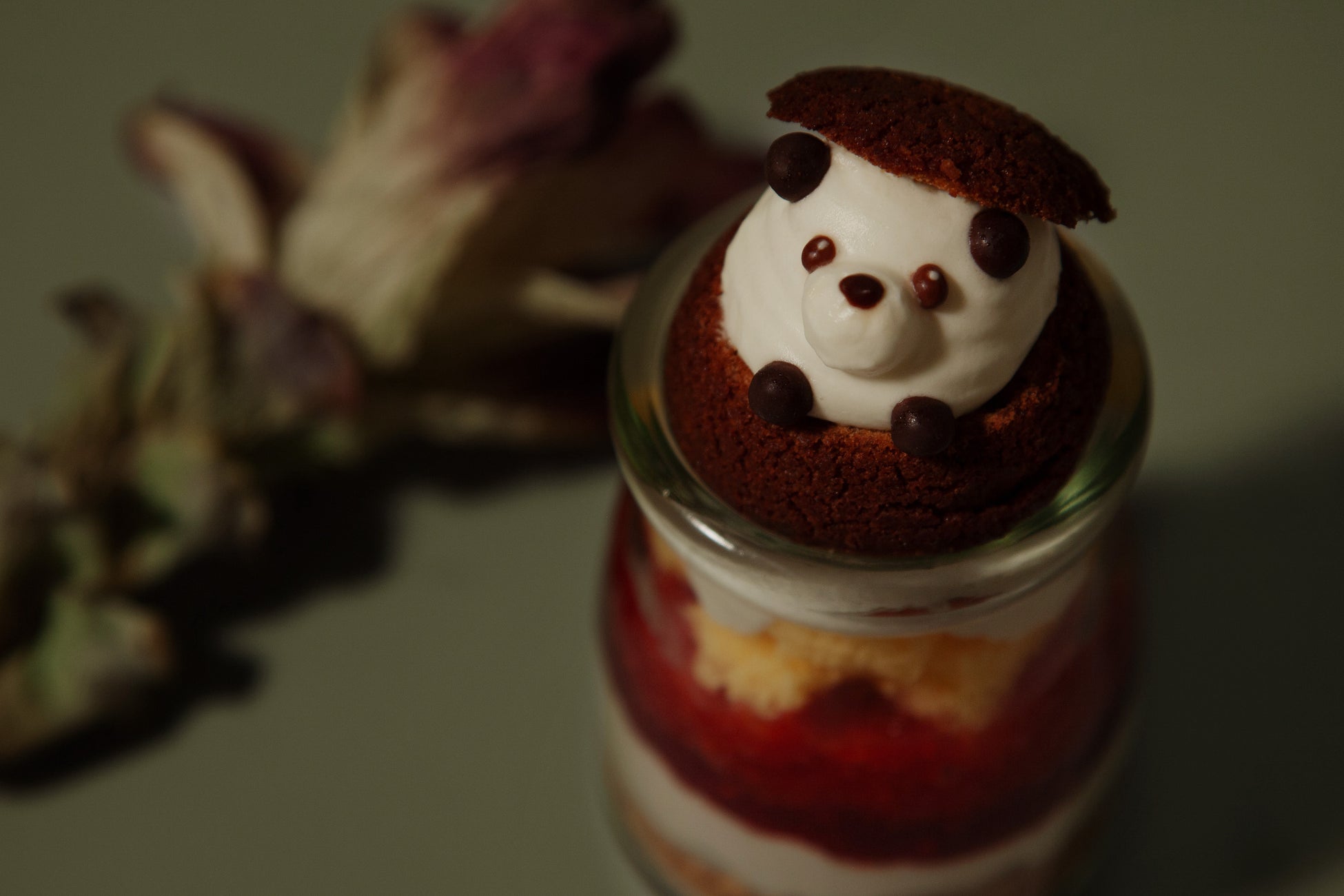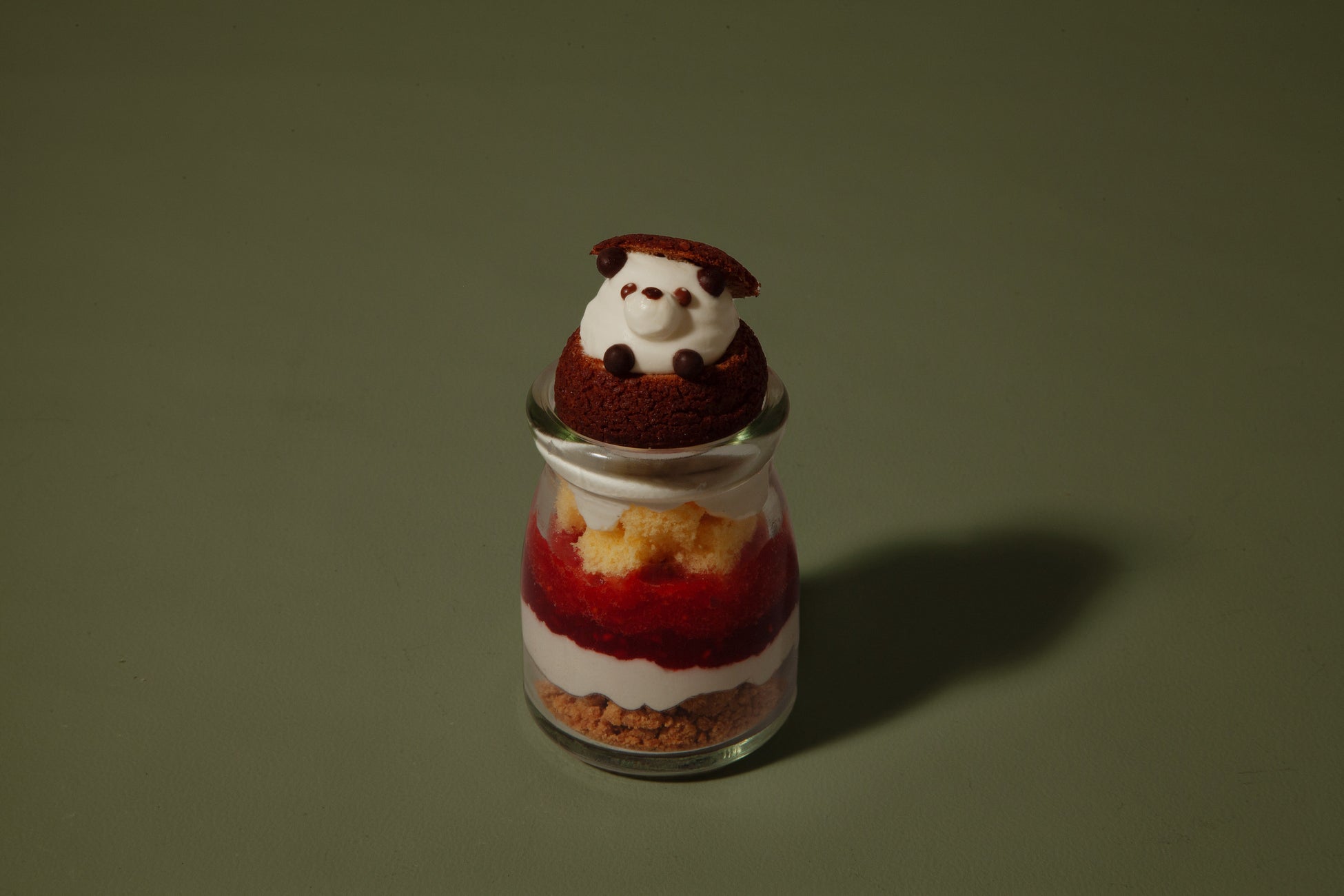 いちごとラズベリーの2種類のソースにバニラの生クリーム。底にあるクッキーのザクザクの食感がアクセントになっています。シュークリームには生クリームとカスタードクリームの2種類を使用。