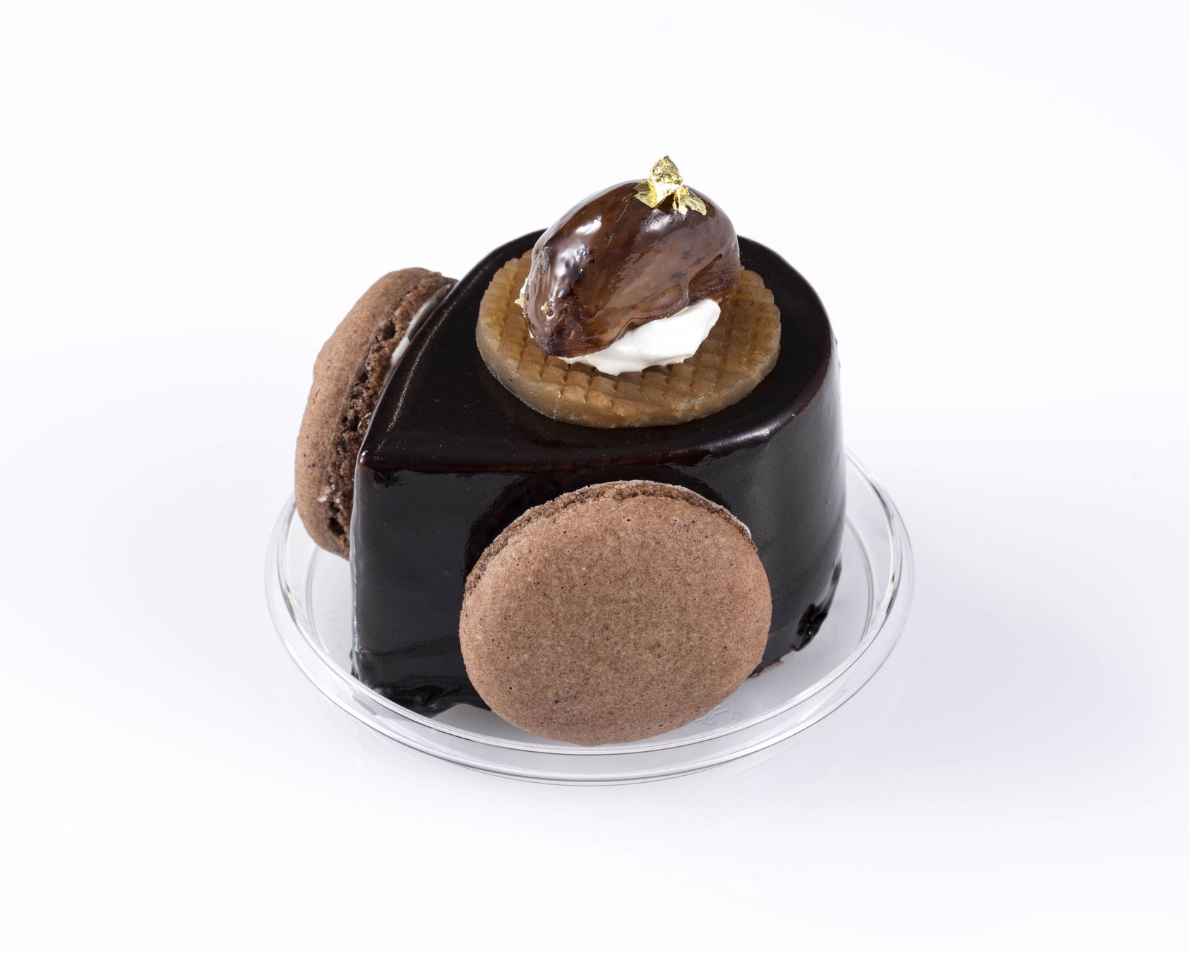 フランス産クーベルチュールを使用した、口どけなめらかなチョコレートケーキです。濃厚なショコラムースの中に、とろけるようなマロンブリュレを閉じ込めました。ケーキの上に飾られたコイン状のマロンペーストが、味のアクセントに。チョコレートとマロンが生み出す、奥深い味わいが魅力です。