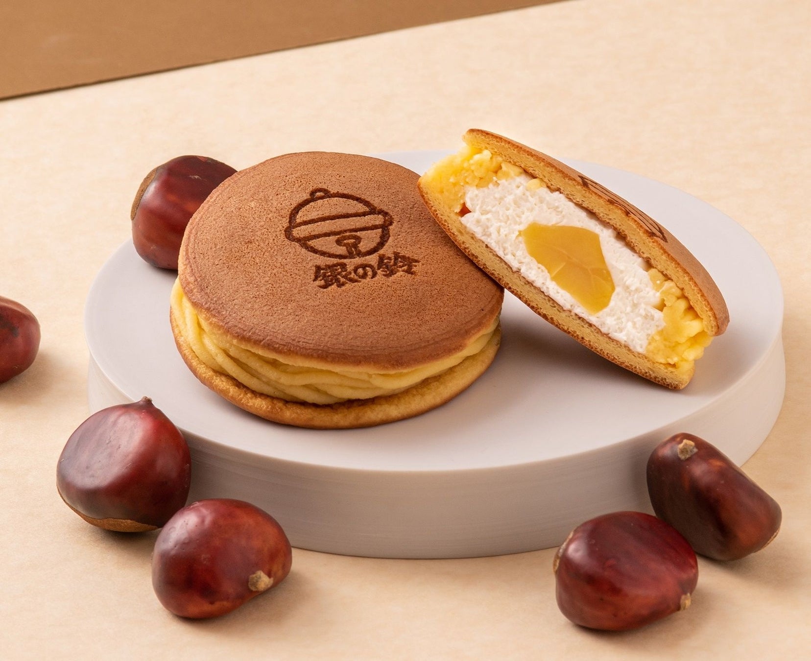 真ん中に栗の甘露煮を入れ、軽い口当たりのホイップクリームとなめらかなマロンクリームを絞り、ふわふわのパンケーキ生地でサンドしました。上面には東京駅待ち合わせ場所のシンボル「銀の鈴」の焼き印が施されています。