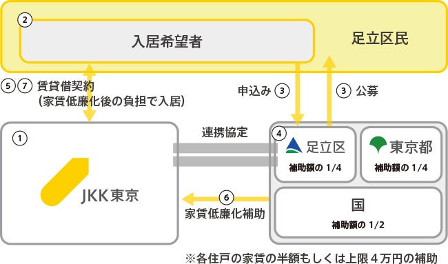 ④ 足立区は、入居希望者の世帯所得等を審査し、足立区・東京都・国による「家賃低廉化補助」の交付を決定