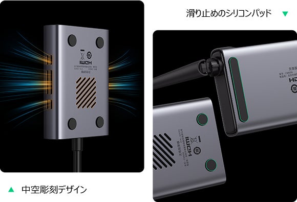 発信機の周りと底部は中空彫刻デザインが採用され、空気が流れやすく冷却性に優れています。