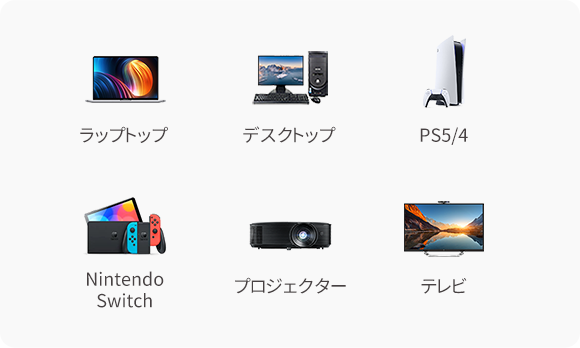 テレビ、セットトップボックス、ノートPC、デスクトップPC、一体型PC、プロジェクター、Switch、PS4、PS5など様々な機種に対応可能です。