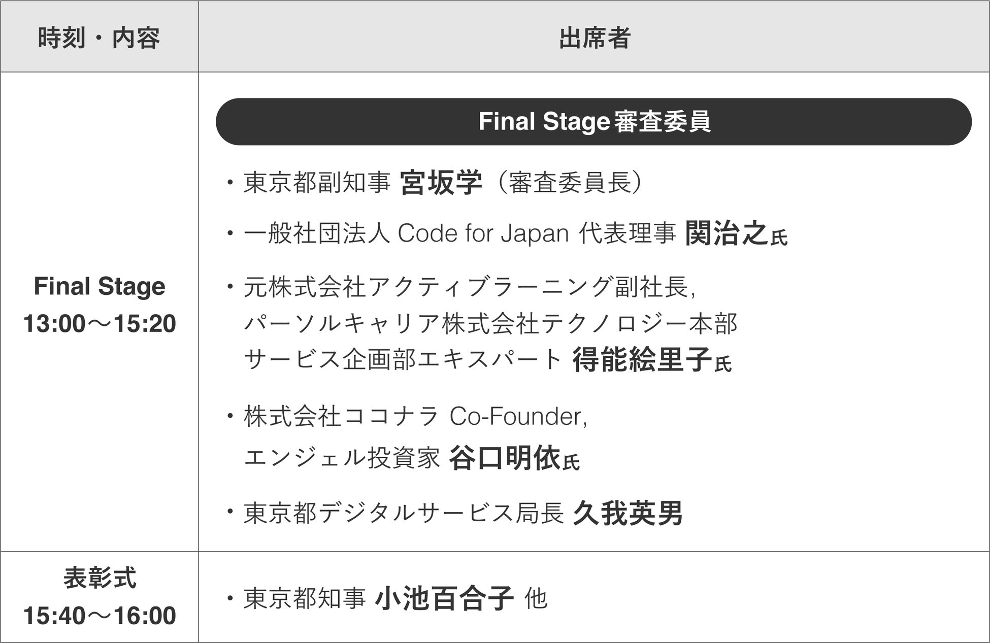 このたび、本プログラムの「First Stage(プレゼン大会)」で優秀作品に選定された10者の中から、最優秀賞である「都知事杯」等を決める「Final Stage」及び、小池知事が出席する「表彰式」を2022年10月12日(水)に行いますので、お知らせいたします。