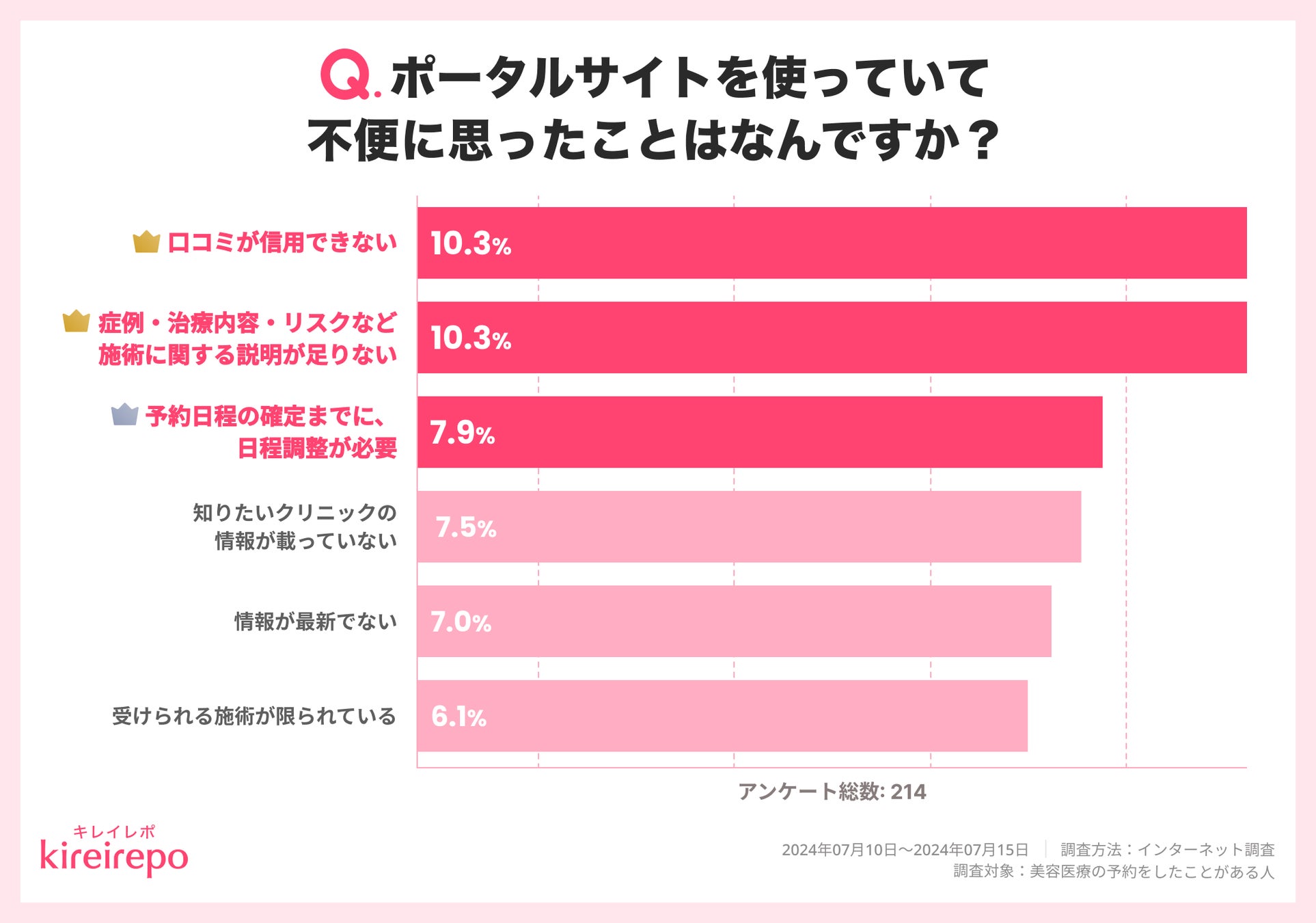「ポータルサイトの不便な点(複数回答可)」を調査したところ、「口コミが信用できない」「症例・治療内容・リスクなど施術に関する説明が足りない」を選んだ人が最も多く、それぞれ10.3%でした。