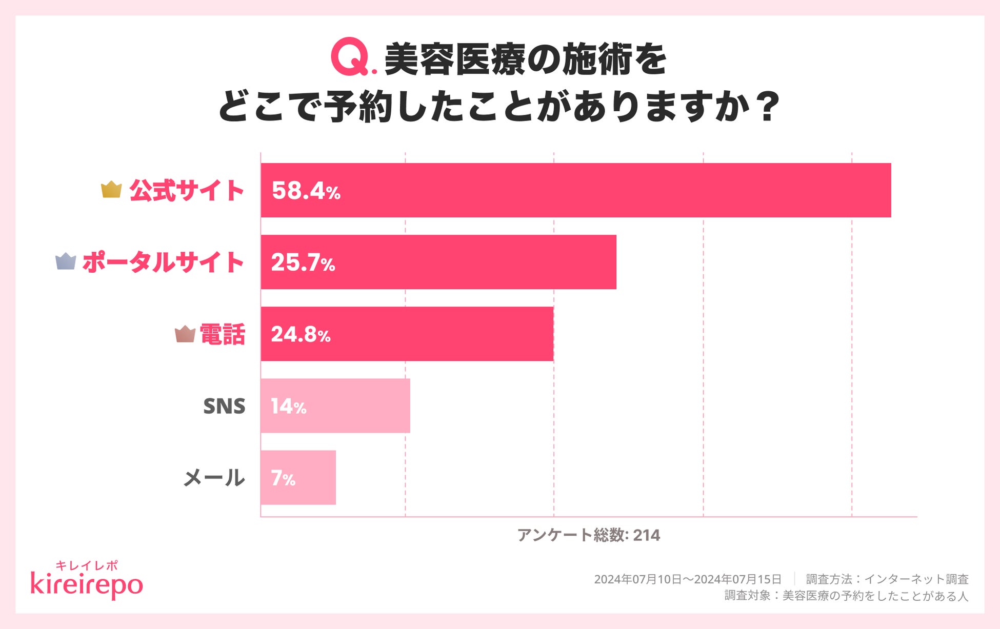 美容医療の経験がある214人に「美容医療の施術をどこから予約したことがありますか?(複数回答可)」と調査したところ、58.4%の人は公式サイトで予約したことがある結果に。続いて、ポータルサイトは25.7%、電話は24.8%でした。