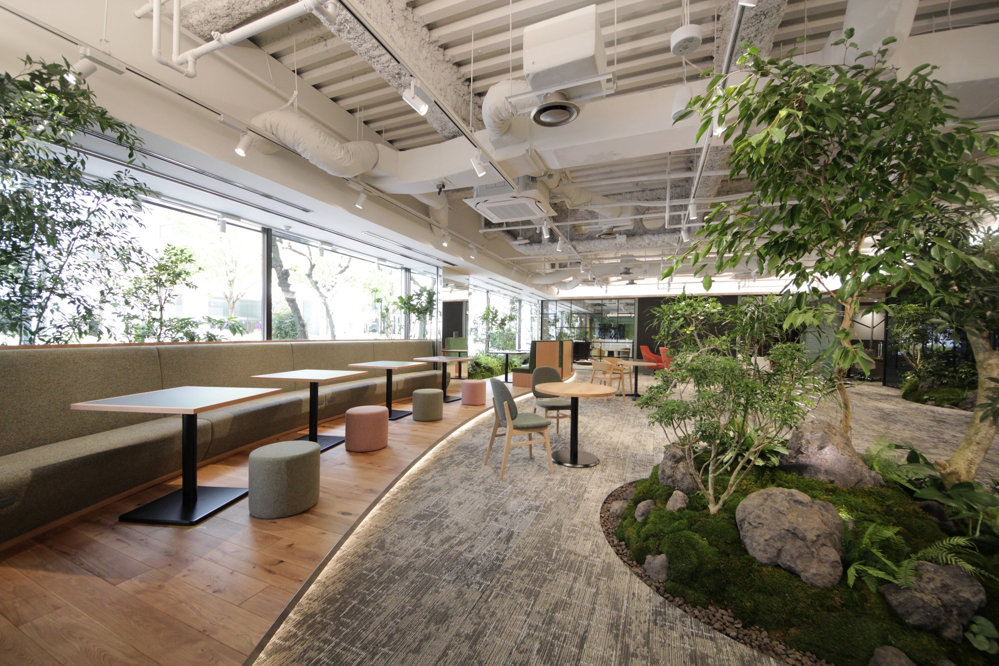 ワークラウンジでは、ベンチコーナーや集中ブース、オンライン会議ブースなど計30席を用意しました。