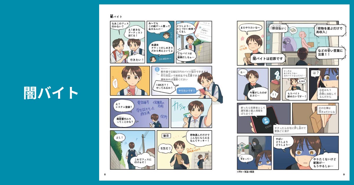 本日より無償配布を開始する新版『騙されない為の教科書』では、「闇バイト」や「オンラインゲーム」をきっかけとした詐欺・悪徳商法、さらには AI を活用した「なりすまし詐欺」など、近年の SNS の急速な拡大に伴い若者をターゲットとして増加している詐欺被害について、実例を交えながら注意点や対処法を解説しています。