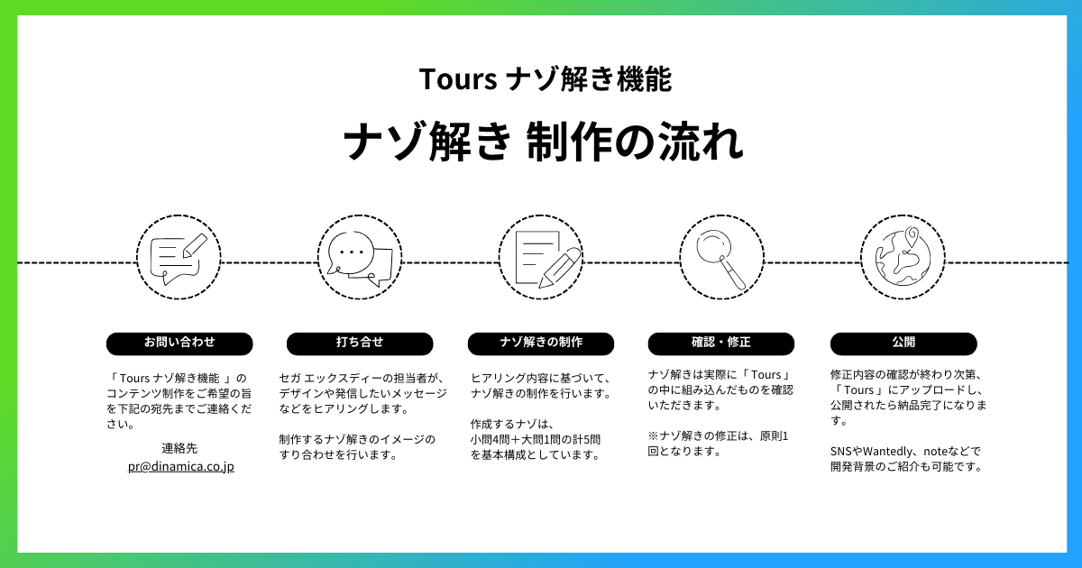 『 Tours ナゾ解き機能 』についてのご連絡先 DINAMICA 小林:pr@dinamica.co.jp |
