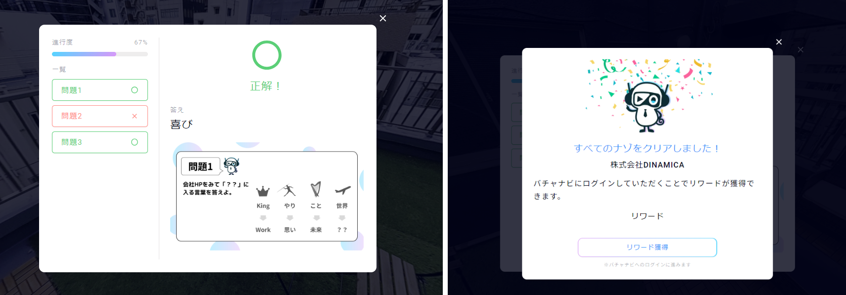 また、「ナゾ」を全問クリアすると求職者に付与できるリワード(報酬)を設定することもできるため、自社について興味が高まる、理解が深まった状態でカジュアル面談や選考など、ネクストアクションに促すことも可能です。