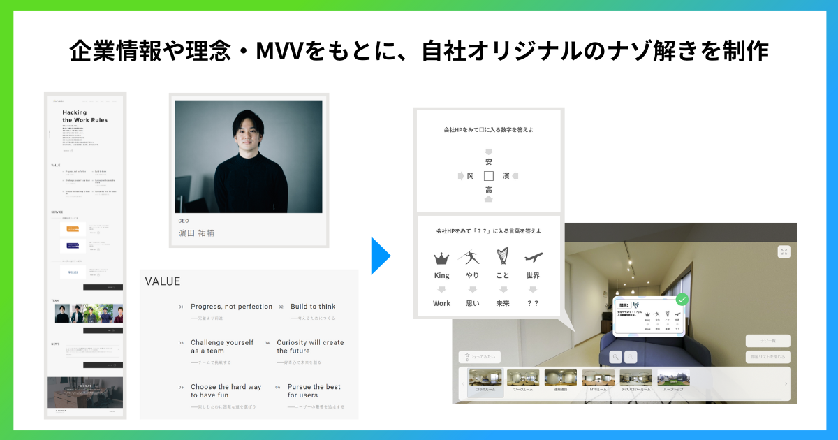 『 Tours ナゾ解き機能 』は、360度画像を使用したバーチャルオフィスツアーができる「 Tours 」内に、企業が設定した「ナゾ解き」コンテンツを掲載できるゲーミフィケーション※を活用したサービスです。求職者は、「ナゾ」を解く過程で能動的に企業情報に触れるため、「ナゾ解き」を楽しみながら企業理解を深めることができます。