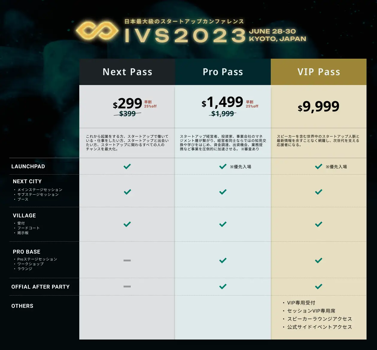 IVS2023 KYOTO / IVS Crypto 2023 KYOTOでは3種類のチケットをご用意しました。チケットの種類によって入れるゾーンや企画が異なります。