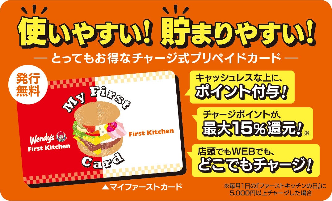 ウェンディーズ・ファーストキッチンとファーストキッチンで無料で発行できるとってもお得なチャージ式プリペイドカードです。 キャッシュレスな上にポイント付与!店舗でもWEBでも、どこでもチャージできて便利♡
