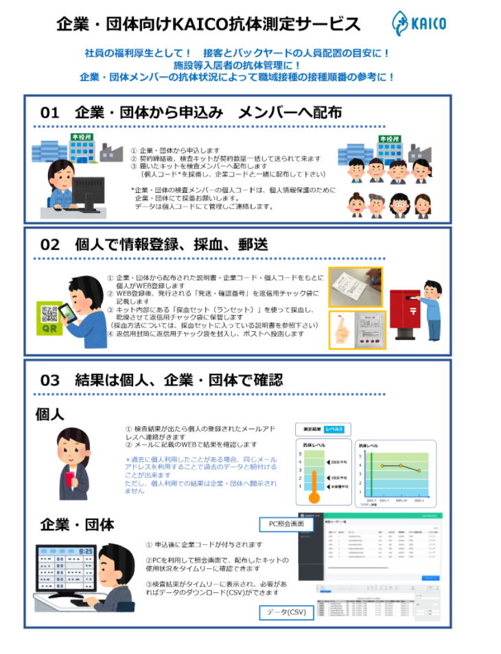 株式会社アルプロンのグループ会社、DTCフィールドで子ども向けの能力遺伝子検査数最大シェア数を誇る株式会社DNA FACTOR(福岡県福岡市:代表取締役 多根和宏)は、2021年9月に新型コロナウイルスに対する血液中の抗体量を、個人で測定できる抗体測定サービスを開始しましたが、新たに九州大学発のベンチャーKAICO株式会社と連携して、企業・団体向けに利用できる抗体測定サービスを販売開始しました。