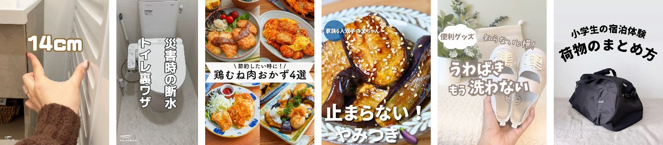 ライフステージの変化に伴い、家庭にまつわる投稿への関心も高いです。「暮らし」では、お手頃に買えるブランドアイテムで生活の質や利便性を高める方法の投稿や、自宅内で存在する身の回りの問題を解決する投稿が人気です(例:収納、家事、洗濯、キッチンやトイレ掃除のコツなど)。「レシピ」や「子育て」では、子育て世帯のユーザーを中心に、家族が喜ぶ簡単時短レシピや節約・作り置きレシピ、子育てママが共通して起きる悩みを解消へ導く投稿が人気です。