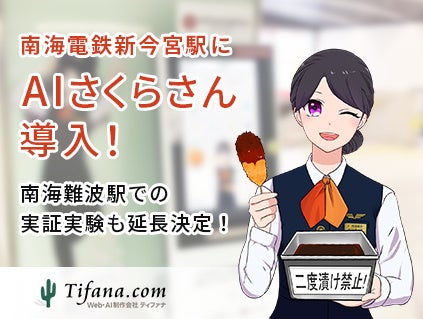株式会社ティファナ・ドットコム(本社:東京都目黒区、代表取締役社長:藤井 亮、以下ティファナ・ドットコム)は、南海電気鉄道株式会社(以下南海電鉄)の難波駅で実施している人工知能(AI)接客システム「AIさくらさん」による実証実験を、2022年4月以降も延長すると同時に、本実験2駅目となる南海「新今宮駅」での実証実験を2022年4月22日より開始します。今回より、串カツを手に持ったAIさくらさんが、トイレの空き情報配信やクイズゲームといった新たな取り組みを加えて鉄道利用者への案内業務を担当します。