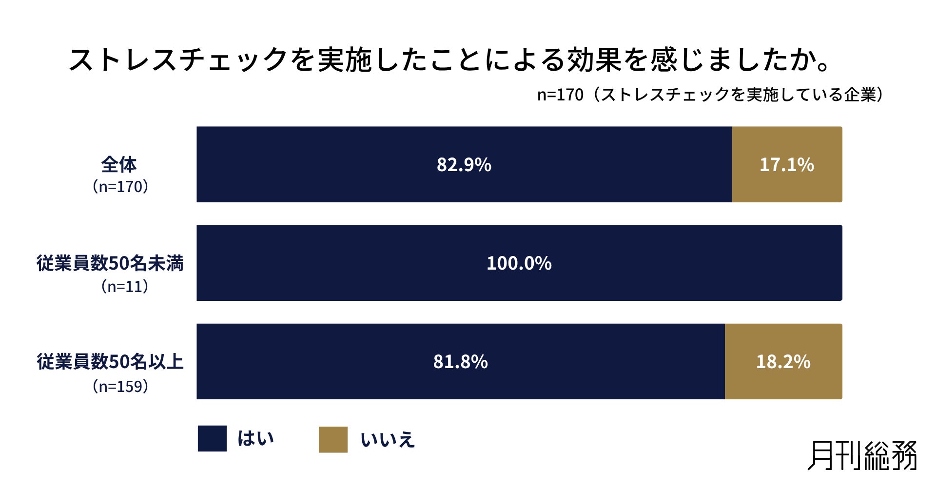 ストレスチェックを実施したことによる効果を感じたか尋ねたところ、8割以上が「効果を感じた」と回答しました。まだ義務化されていない中で実施している従業員数50名未満の企業の方は、全員が「効果を感じた」と回答しました(n=170/ストレスチェックを実施している企業)。
