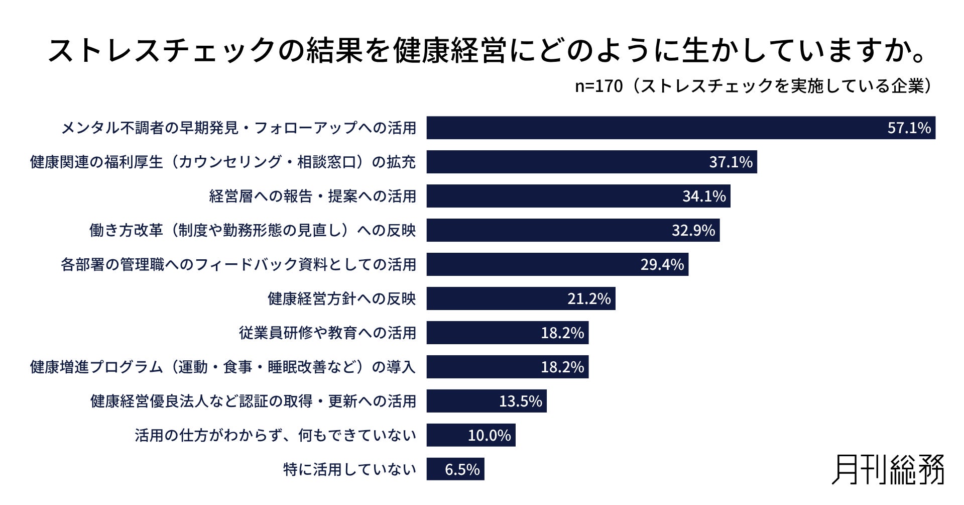 ストレスチェックの結果を健康経営にどのように生かしているか尋ねたところ、「メンタル不調者の早期発見・フォローアップへの活用」が57.1%で最多となりました(n=170/ストレスチェックを実施している企業)。