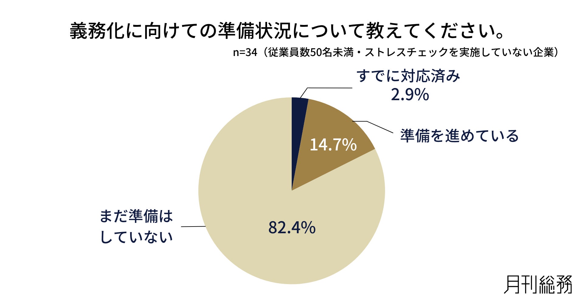 従業員数50名未満で現在ストレスチェック未実施の企業に対し、義務化に向けての準備状況について尋ねたところ、8割以上が「まだ準備はしていない」と回答しました(n=34/従業員数50名未満でストレスチェックを実施していない企業)。