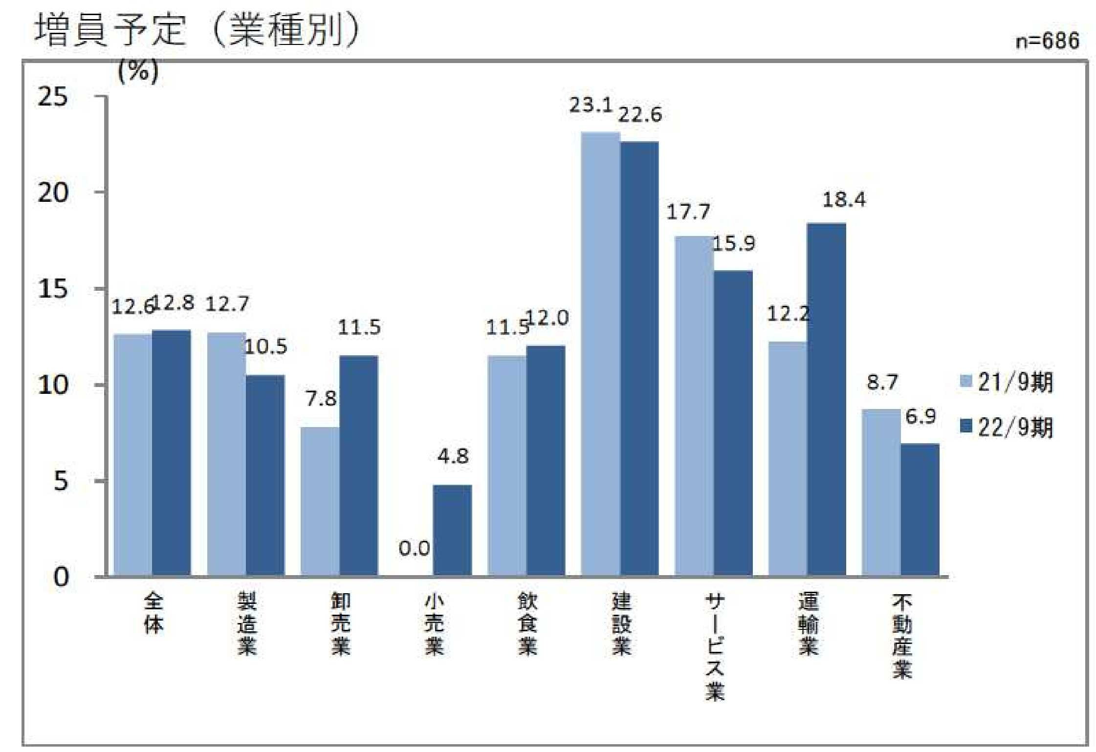 来春の採用計画は、「採用する」が27.2%(前年29.9%)と減少しましたが、「昨年より増員」は12.8%(前年12.6%)と0.2ポイント上昇しました。特に建設業は22.6%、運輸業は18.4%となり、事業の再開・拡大に向け、人材確保に懸命な企業が増加しています。