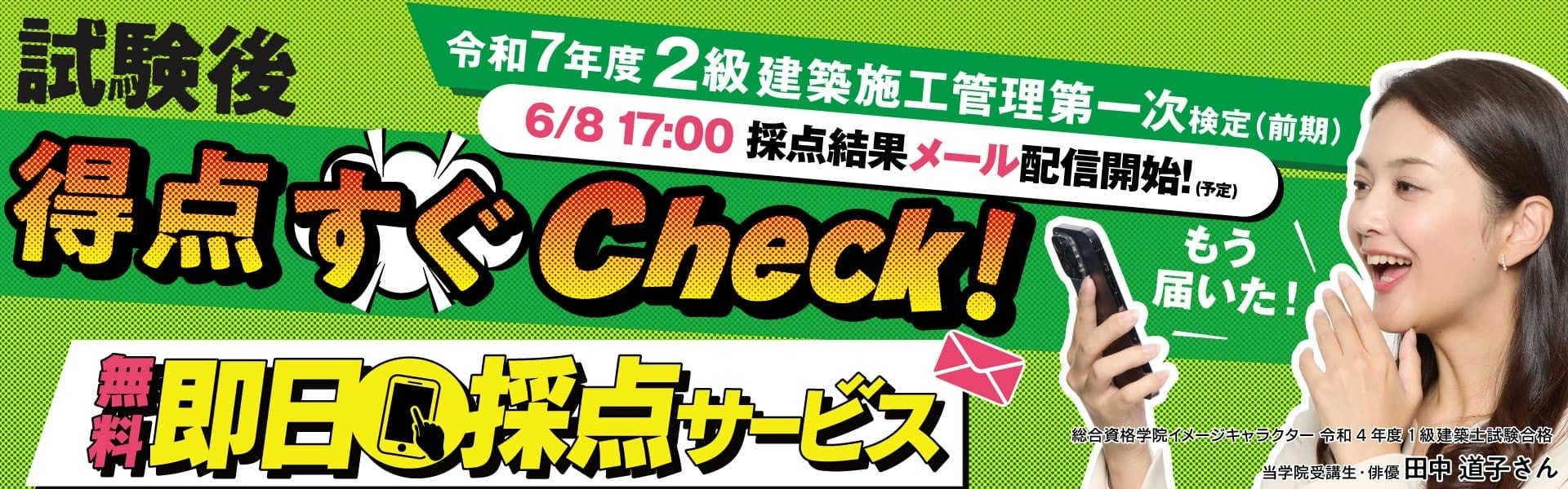 【2025年度 2級建築施工管理技術検定】 無料「即日採点サービス」 本日6/8(日)17時~採点結果配信!11時~受付開始【総合資格学院】