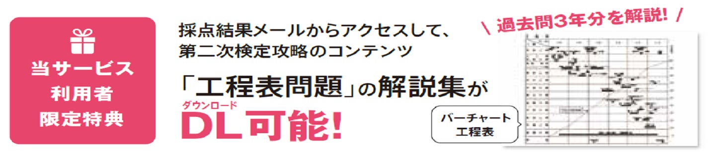 「即日採点サービス」をご利用いただいた方限定で、第二次検定の試験対策に役立つ「工程表問題」の解説をまとめた資料集(過去3年分)をプレゼントいたします。即日採点サービスの返信メールに記載されているURLよりダウンロードできます。