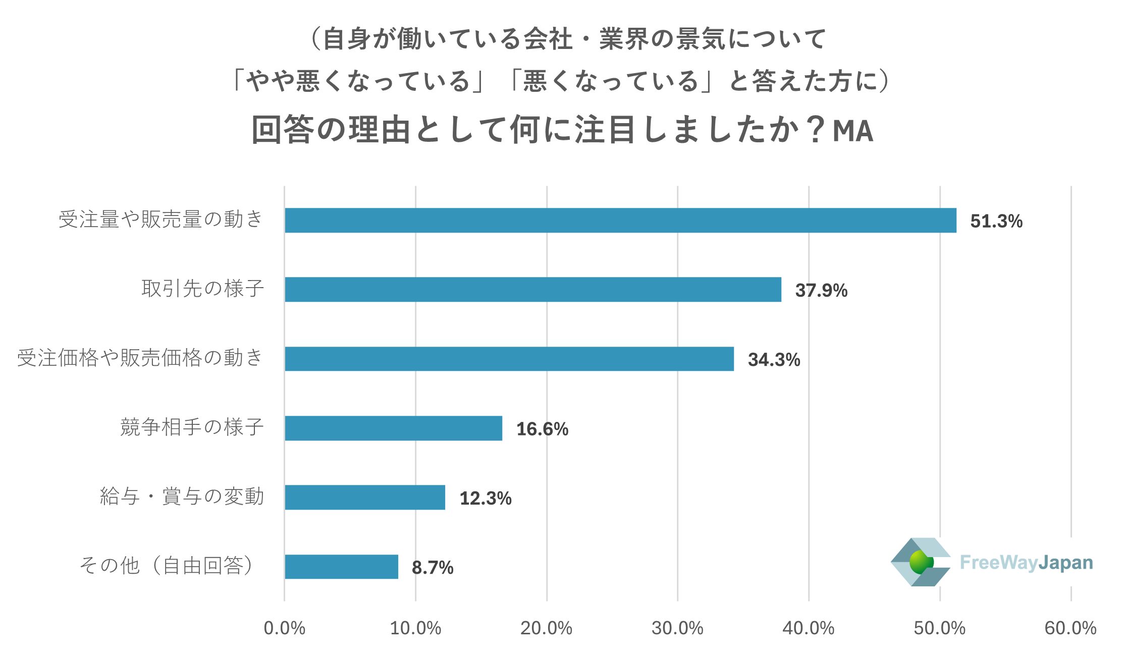 上記で「やや悪くなっている」「悪くなっている」と答えた方に、回答の理由として何に注目したか聞いたところ、「受注量や販売量の動き」が51.3%、「取引先の様子」が37.9%、「受注価格や販売価格の動き」が34.3%、「競争相手の様子」が16.6%、「給与・賞与の変動」が12.3%、その他(自由回答)が8.7%という結果だった。